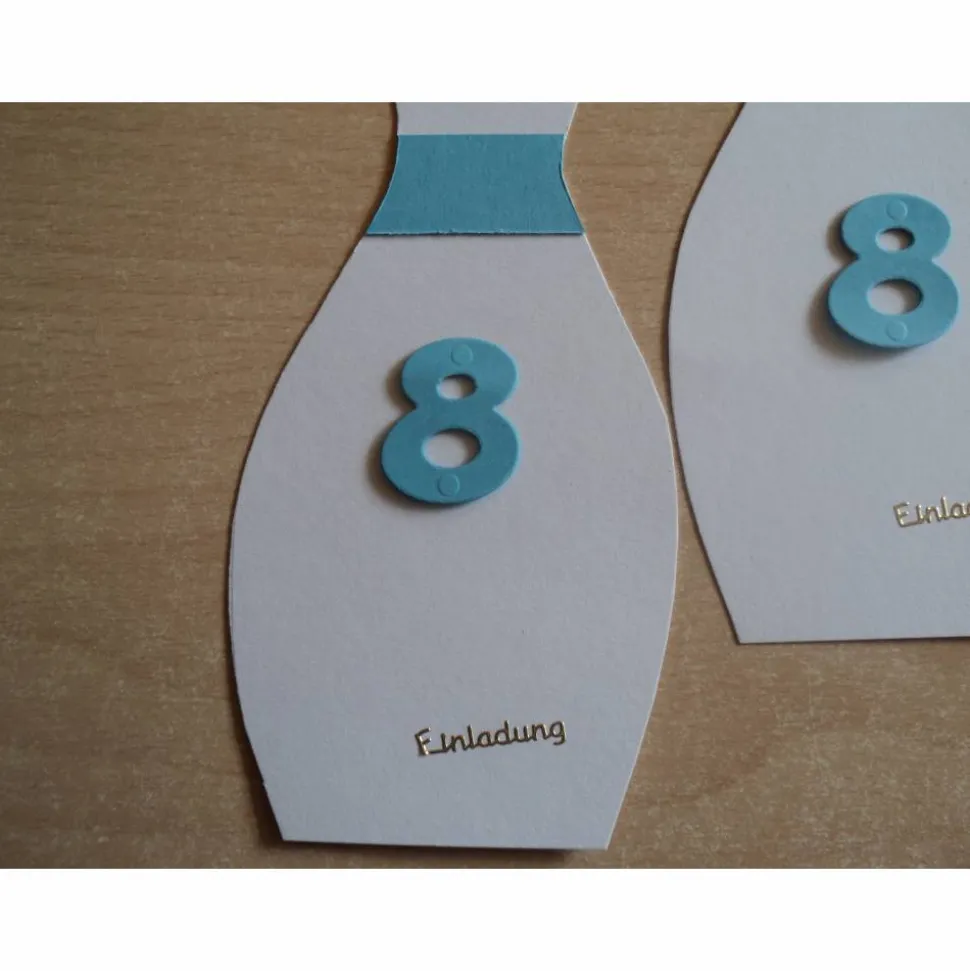 Hier seht ihr ein Set von 4 schönen Einladungskarten zum Kindergeburtstag für einen netten Tag beim Kegeln für ein Mädchen oder Jungen