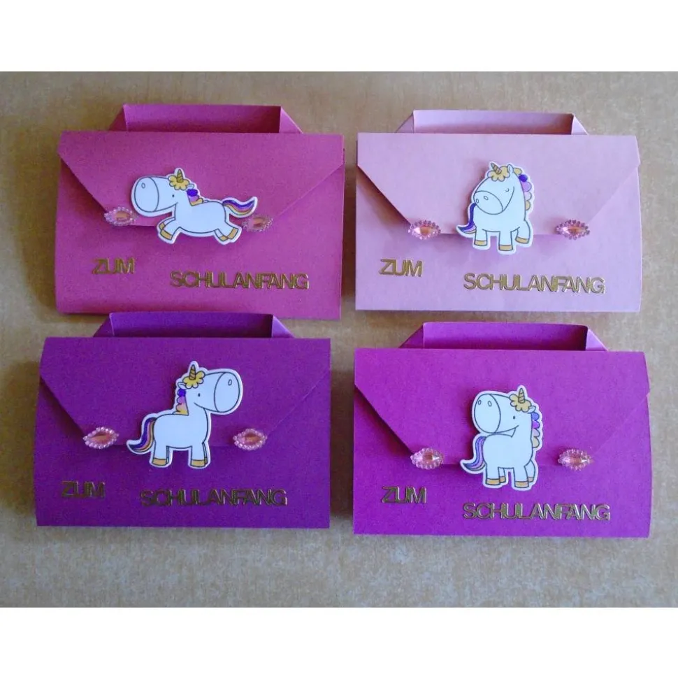 verziert wurden diese Schulanfang/Einschulung Karten mit 3d Motiv,stickern Perlen Einhorn,Stanzer,Stempel,..