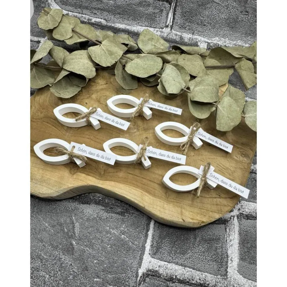 Die Fische sind aus einer Keramikgießmasse, mit einem Juteband und Spruch versehen.