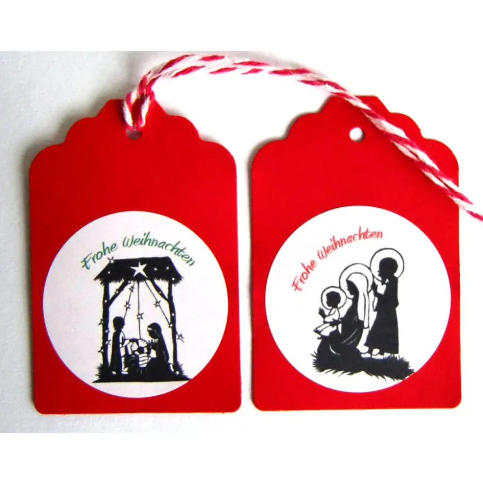 Geschenkanhänger für Weihnachten. Rot und schwarz, verziert mit runden Aufklebern „Frohe Weihnachten“ und wunderschönen Scherenschnitt Motiven.