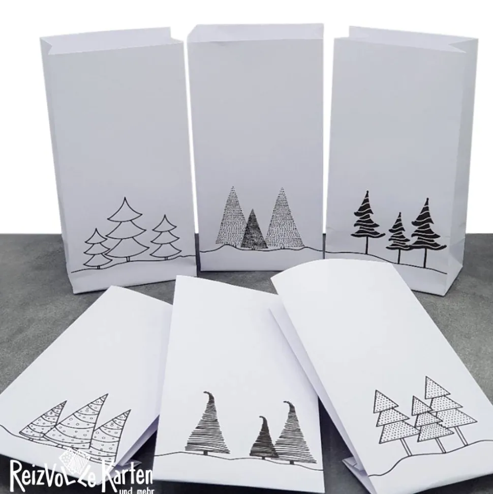 Entdecke 6 handgefertigte Papiertüten mit aufgedruckten unterschiedlichen Tannenbäumen!