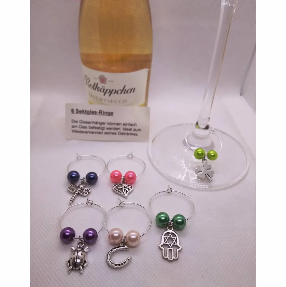 6 verschließbare Markierungsringe die mit pinkfarbenen Glaswachsperlen bestückt sind und jeweils einen Anhänger „Glücksmotiv“ in der Mitte haben. Die Ringe können um jedes Stielglas gelegt werden.
