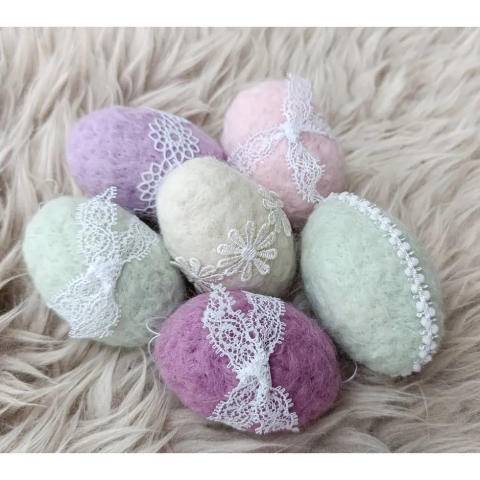 Auch der Kern wurde ganz aus Wolle genadelt. Schöne zarte weiße Spitzenbänder wurden zu jedem Ei passend ausgesucht. Da sie in Nadelfilztechnik angefertigt sind, haben sie eine weiche strukturierte Oberfläche.