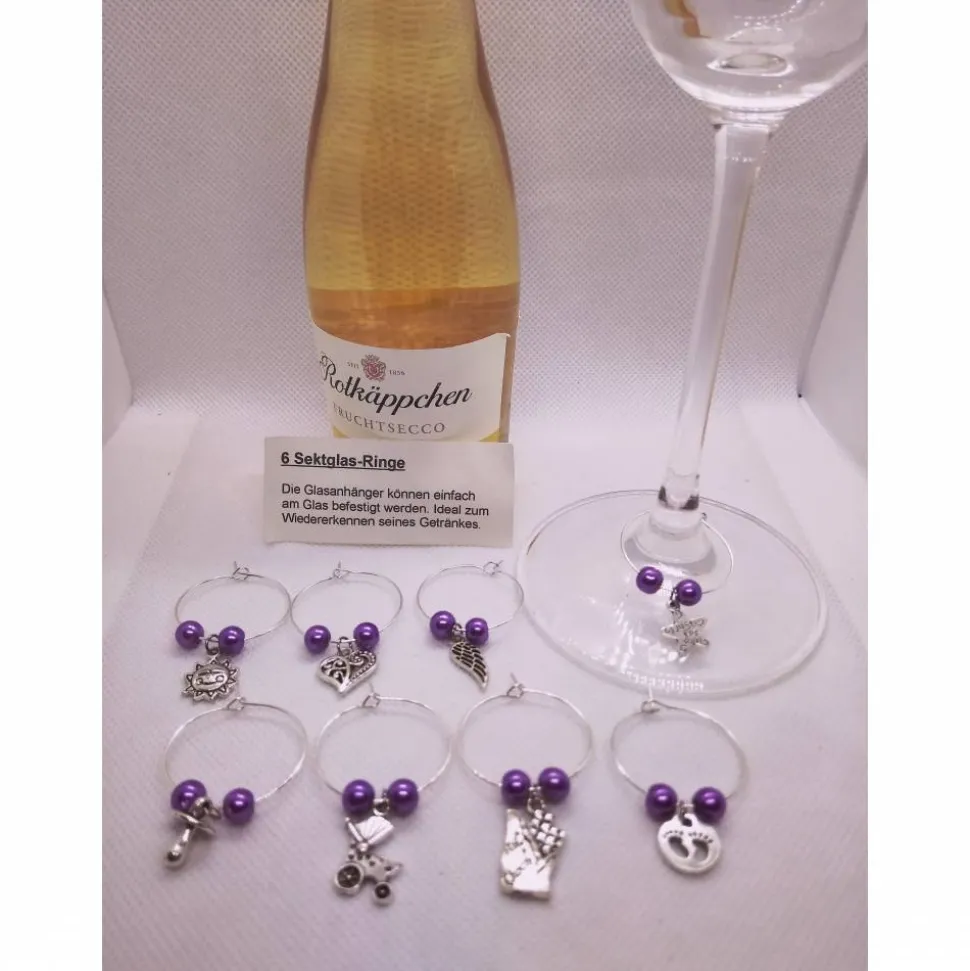 8 verschließbare Markierungsringe die mit lilanen Glaswachsperlen bestückt sind und jeweils einen Motiv Anhänger in der Mitte haben. Die Ringe können um jedes Stielglas gelegt werden.