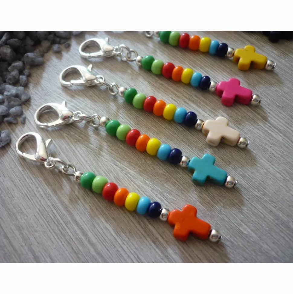 Ein Howlithkreuz ( 8mm breit & 10 mm hoch ) Metallperlen und bunte Rocailles ( Durchmesser 4,5mm ) sind auf einem Nietstift aufgereiht. Dieser ist mit einer Öse an dem dunkelsilbernen Karabiner ( ca 1,6 cm hoch 9 befestigt. Die Gesamtlänge beträgt ca 6,2 cm.