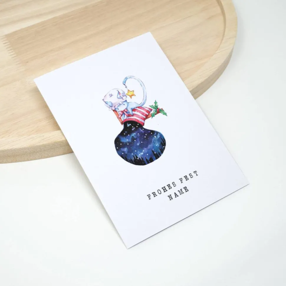 Die Katze Pumpkin lässt es schneien. Versehe die süße Weihnachtskarte mit einem Wunschnamen, wenn du möchtest.