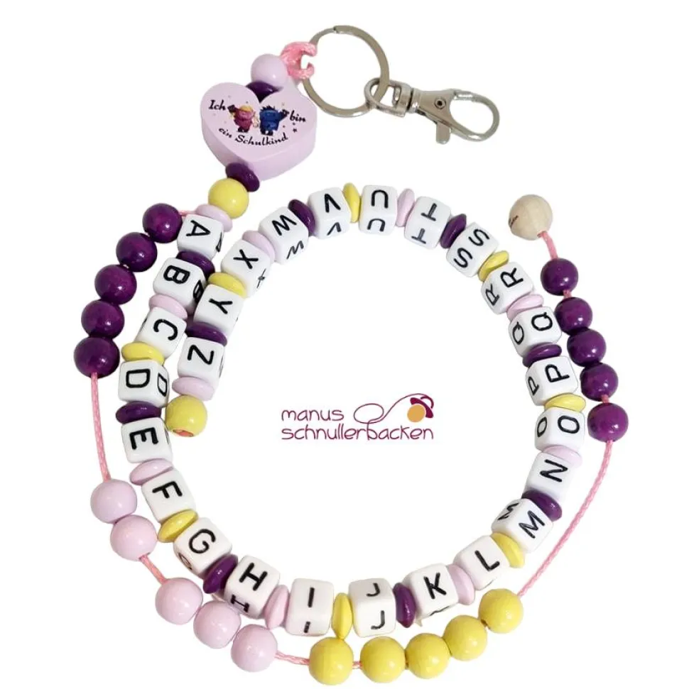 ABC-Rechenkette mit Motivherz “ Ich bin ein Schulkind“ in Rosa, Purpurlila, Pastellgelb