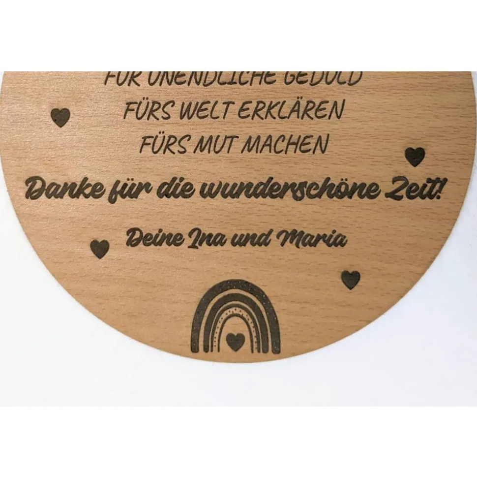 Hergestellt aus hochwertiger Holzfaserplatte mit einer ansprechenden Oberflächenveredelung und liebevoll gestaltet, ist dieses Geschenk nicht nur eine Dekoration, sondern auch eine bleibende Erinnerung an die bedeutende Rolle, die Ihre Erzieherin im Leben Ihres Kindes gespielt hat. Zeigen Sie Ihre Wertschätzung auf eine persönliche und nachhaltige Weise mit diesem individuellen Geschenk, das für viele Jahre Freude und Erinnerungen bringen wird.