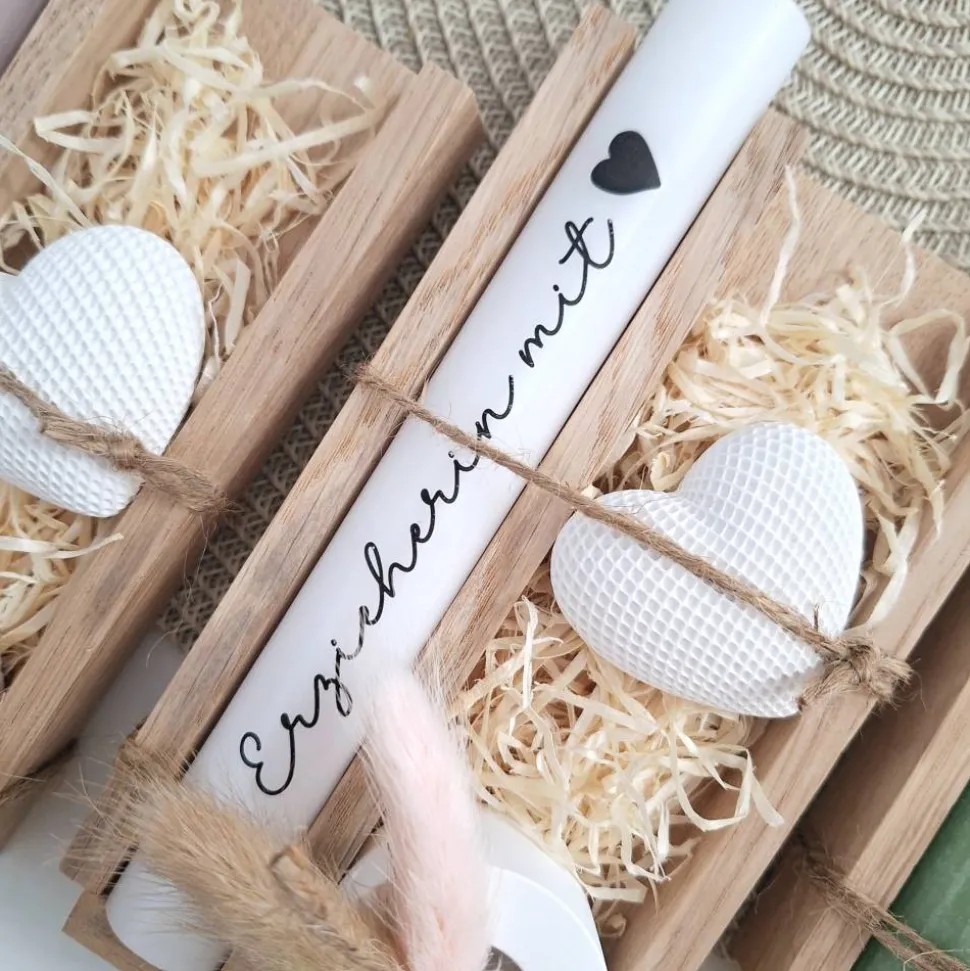 Das Kerzenset besteht aus einer Kerze (in der Farbe deiner Wahl) mit einer Aufschrift deiner Wahl, einem passenden runden Kerzenhalter und einem Dekoherz.