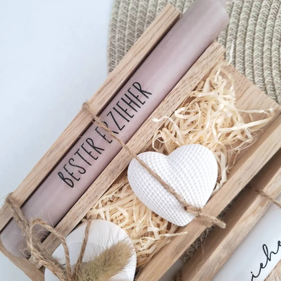 Das Geschenkset wird in einer Holzbox zusammengebunden, mit Trockenblumen (können variieren) verziert und mit einem Anhänger “ DANKESCHÖN “ ergänzt.