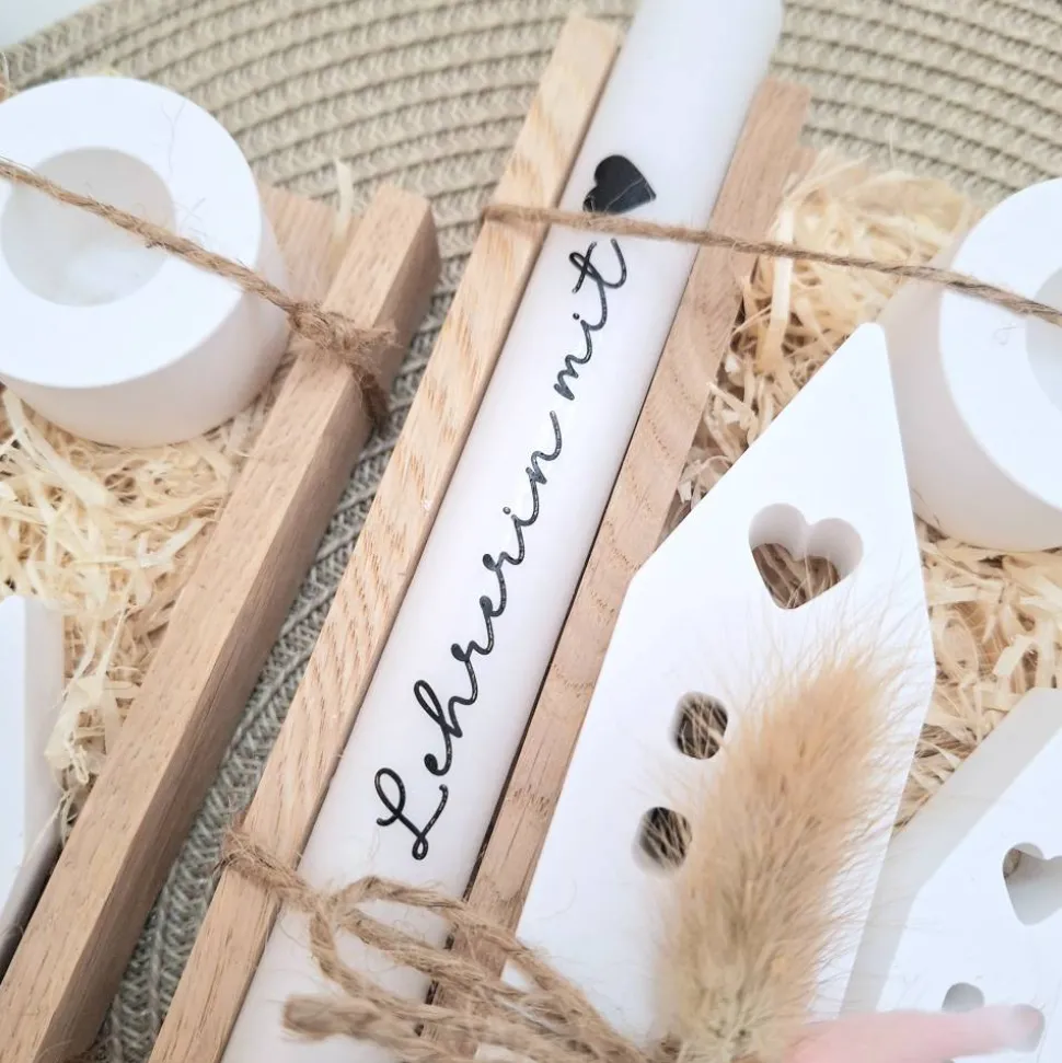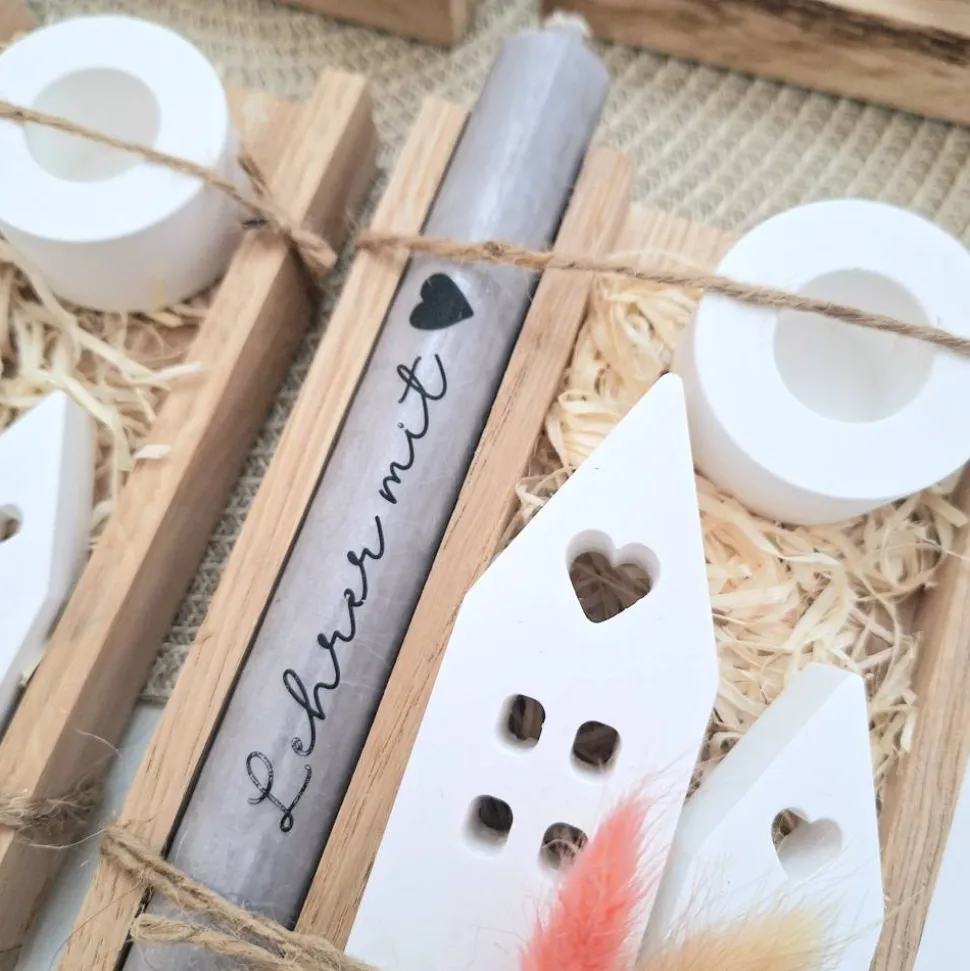 Das Kerzenset besteht aus einer Kerze (in der Farbe deiner Wahl) mit einer Aufschrift deiner Wahl, einem passenden runden Kerzenhalter und zwei Häuser / Lichthäuser.