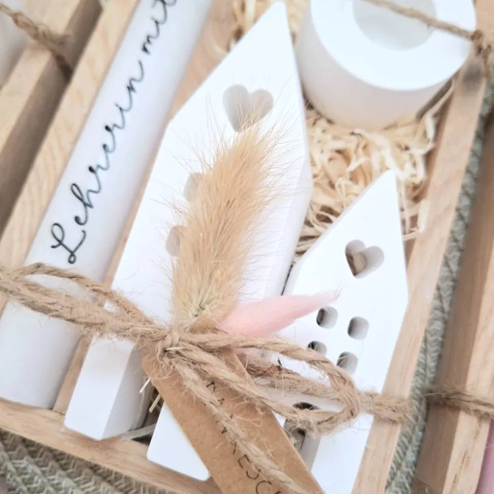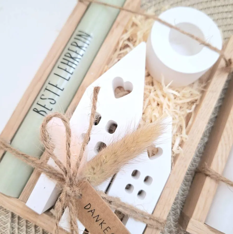 Das Geschenkset wird in einer Holzbox zusammengebunden, mit Trockenblumen (können variieren) verziert und mit einem Anhänger “ DANKESCHÖN “ ergänzt.