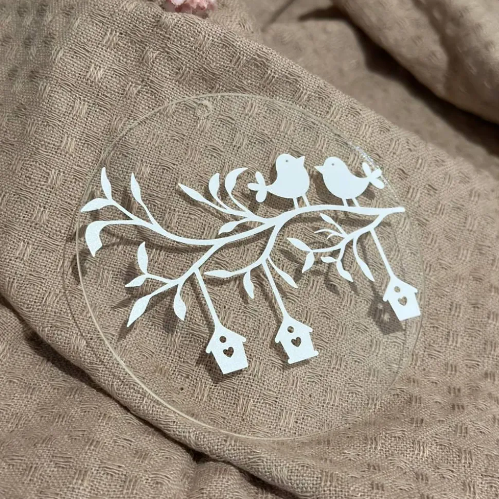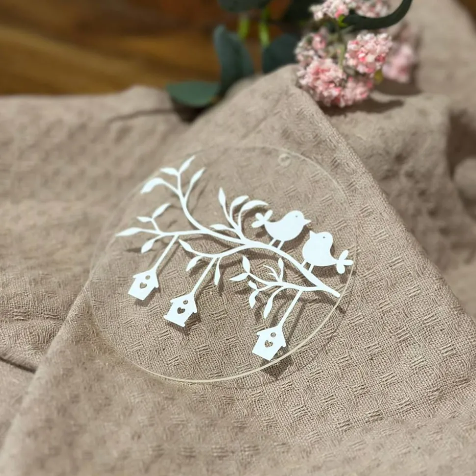 Dank des integrierten Lochs lässt sich die Scheibe spielend leicht mit einem Band oder einer Schnur aufhängen, wodurch sie flexibel an Fenstern, Wänden oder sogar an Kränzen befestigt werden kann. Besonders in der Frühlings- und Osterzeit bringt die Acrylglasscheibe „Vögel auf Ast“ eine frische und freundliche Atmosphäre in jeden Wohnbereich.