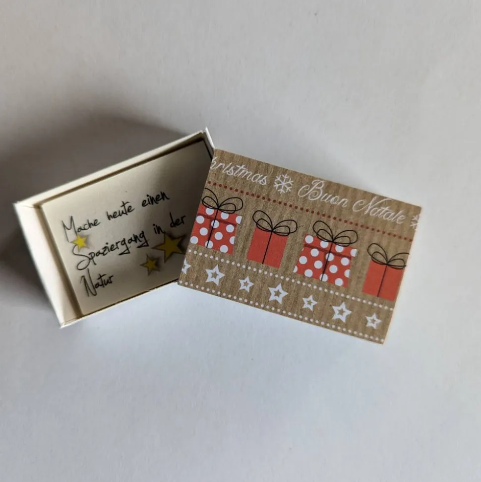 Eine weihnachtliche verzierte Streichholzschachtel mit 24 kleinen Kärtchen. Auf den Minikärtchen sind Dinge aufgeschrieben, die einen den Tag erhellen sollen. Aufgaben die einem selbst guttun, oder auch anderen…