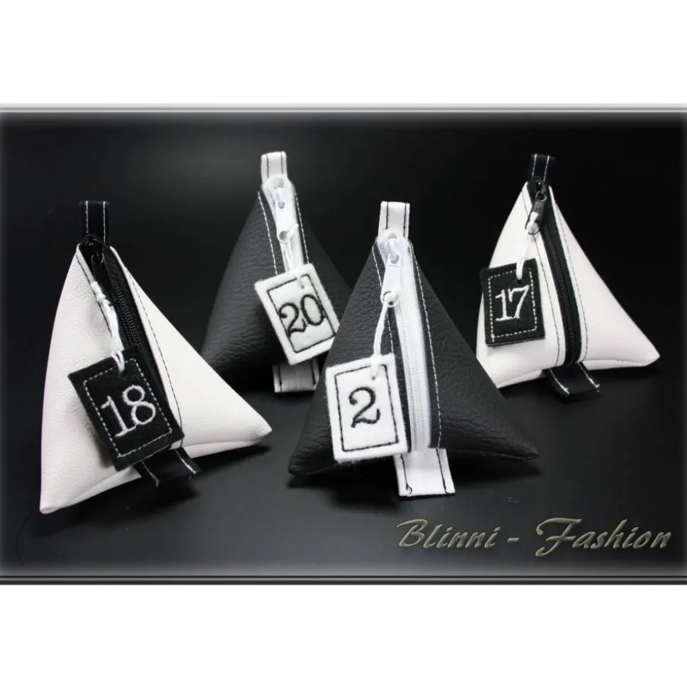 Die Adventskalender-Pyramiden sind aus Nappaleder-Imitat genäht und werden mit einem Reißverschluß geschlossen. Durch die eingenähte Schlaufe lassen sich Die Adventskalender-Säckchen prima auch aufhängen.