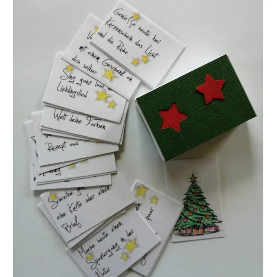 Eine weihnachtliche verzierte Streichholzschachtel mit 24 kleinen Kärtchen. Auf den Minikärtchen sind Dinge aufgeschrieben, die einen den Tag erhellen sollen. Aufgaben die einem selbst guttun, oder auch anderen…