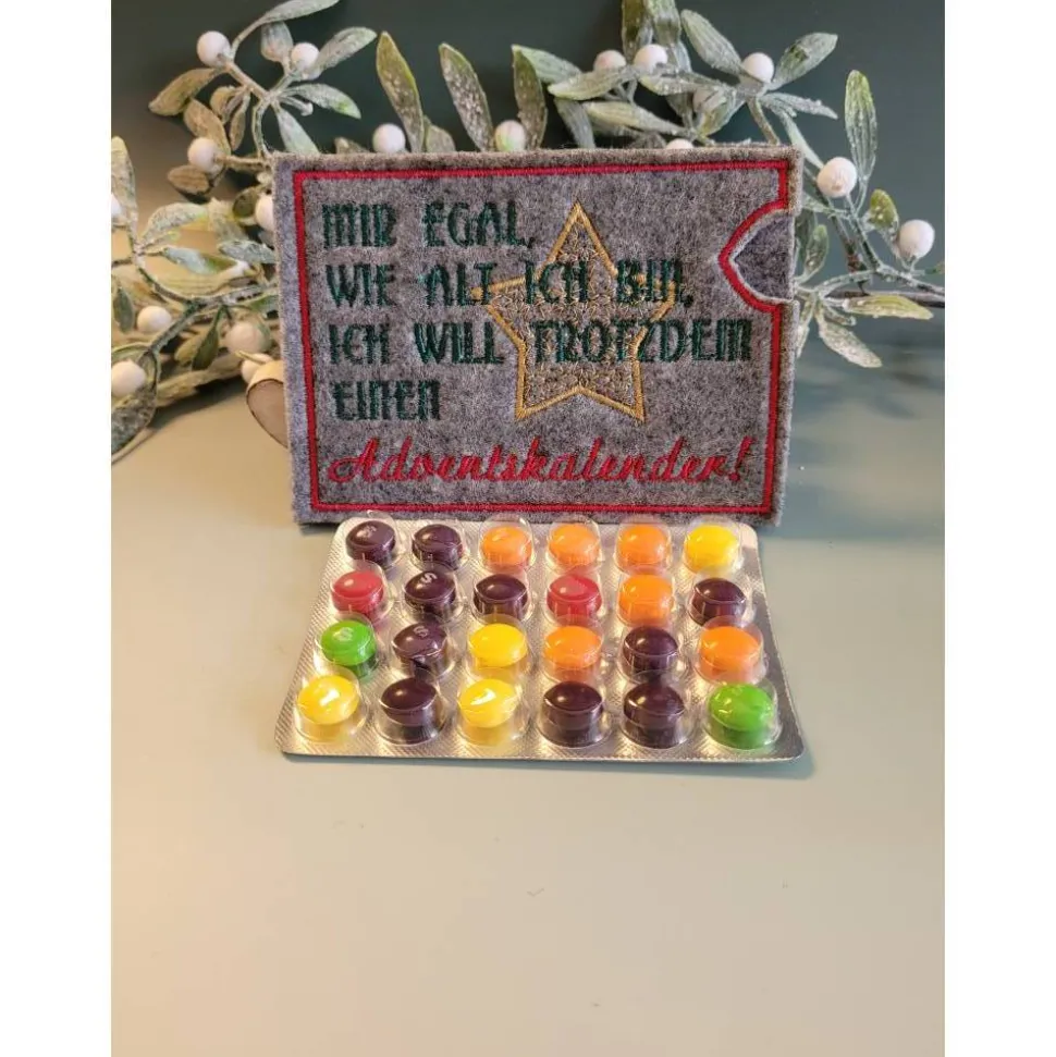 Diesen mit den Spruch“ Mir egal wie alt ich bin ich will trotzdem einen Adventskalender“ „habe ich auf Filz bestickt.