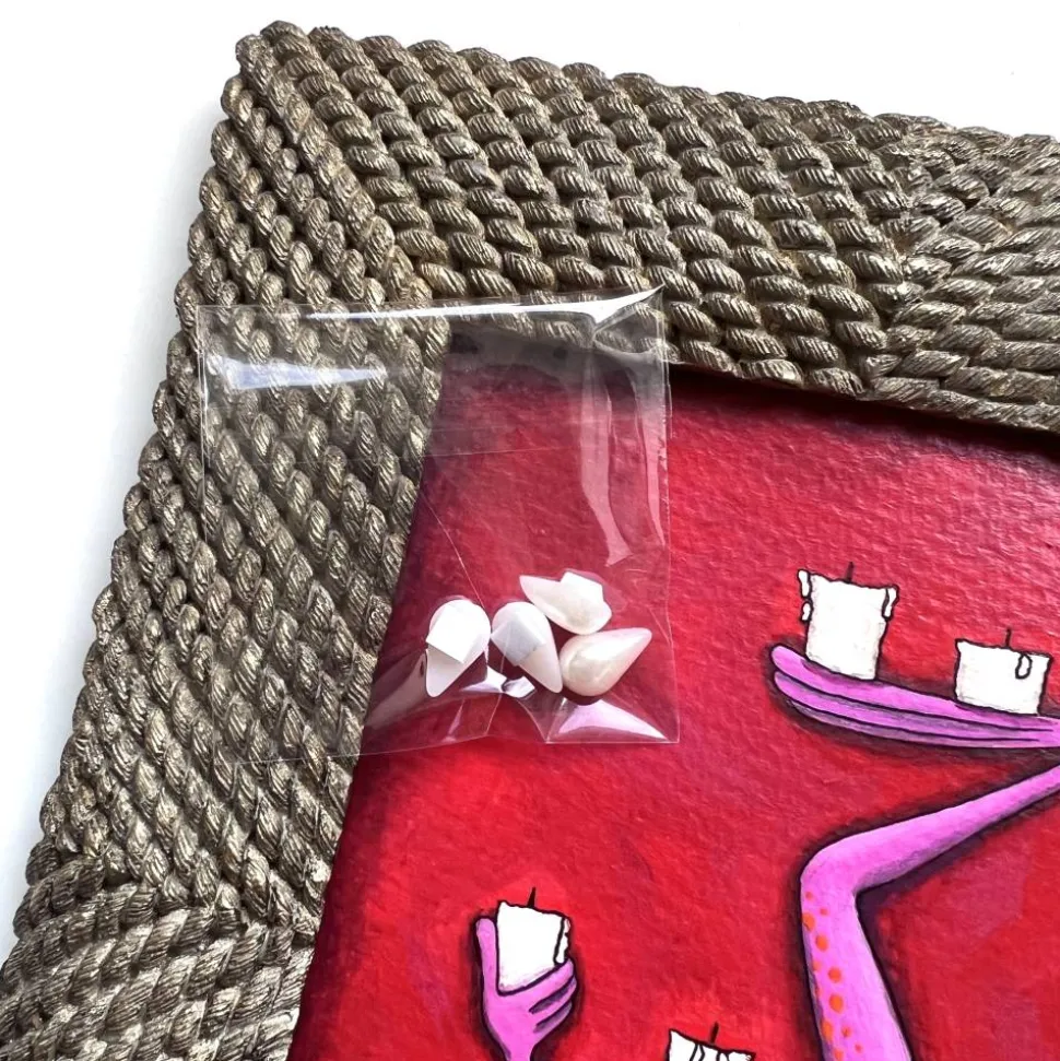 schweres Ölmalpapier, Künstler-Acrylfarben, Goldrahmen mit Echtglas, Tusche, Kunststoff-Perlmuttflammen, doppelseitiges Klebeband