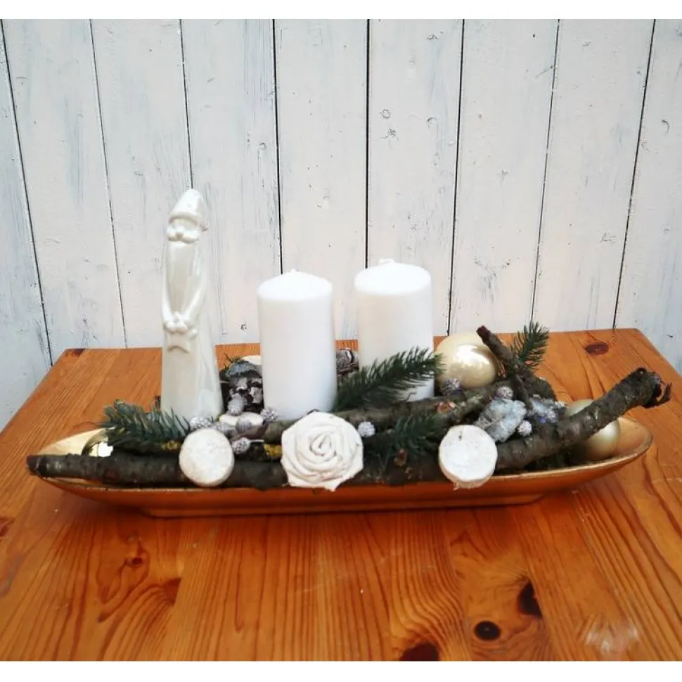 Material: Holztablett, Kerzen, künstliches Grün, Glaskugeln, Keramiknikolaus, Dekorationen