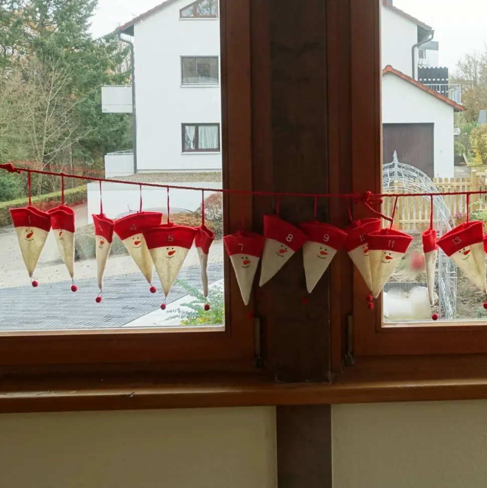 Adventskalender aus Filzmützen mit stilisiertem Schneemann-Gesicht