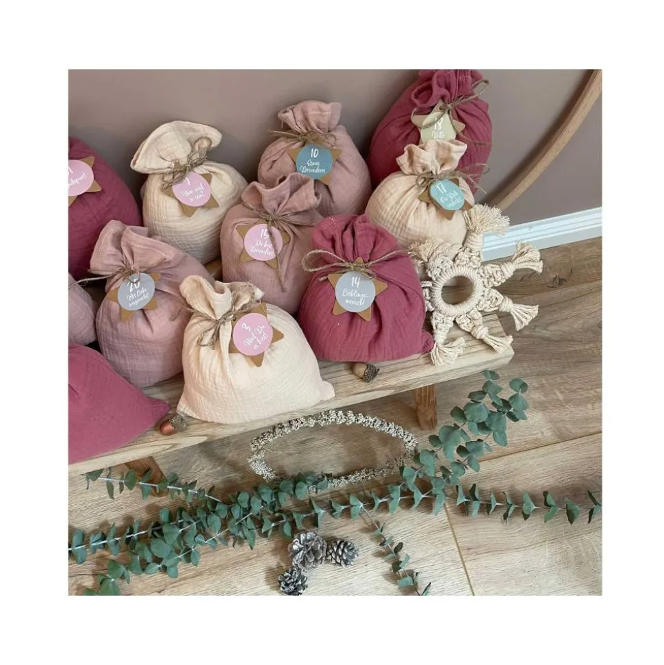 Die 24 Tütchen unseres handgenähten Adventskalenders aus Musselin haben eine eingenähte Jutekordel zum Verschließen, dass somit nicht verloren gehen kann. Jeweils sechs Säckchen sind in der gleichen Farbe genäht. Wir haben für euch die vier Farbensand, beige, rosa und mauve zusammen gestellt. Zum Lieferumfang gehören zusätzlich 24 Pappsterne aus Kraftpapier mit Loch zum Einfädeln des Jutebands und 24 Zahlenaufkleber in Pastellfarben.