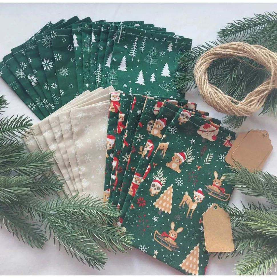 Die 24 Stoffsäckchen bestehen aus 100% Baumwolle und sind in vier verschiedenen Designs enthalten und haben eine Größe von ca. 11 x 18 cm.
