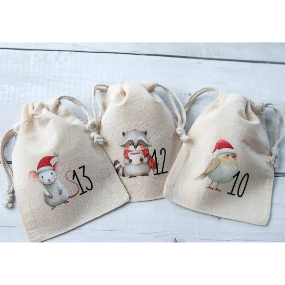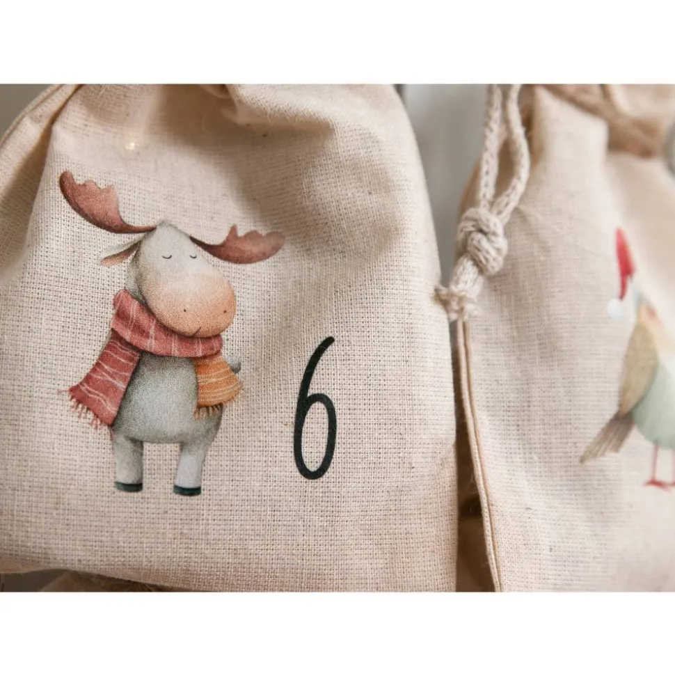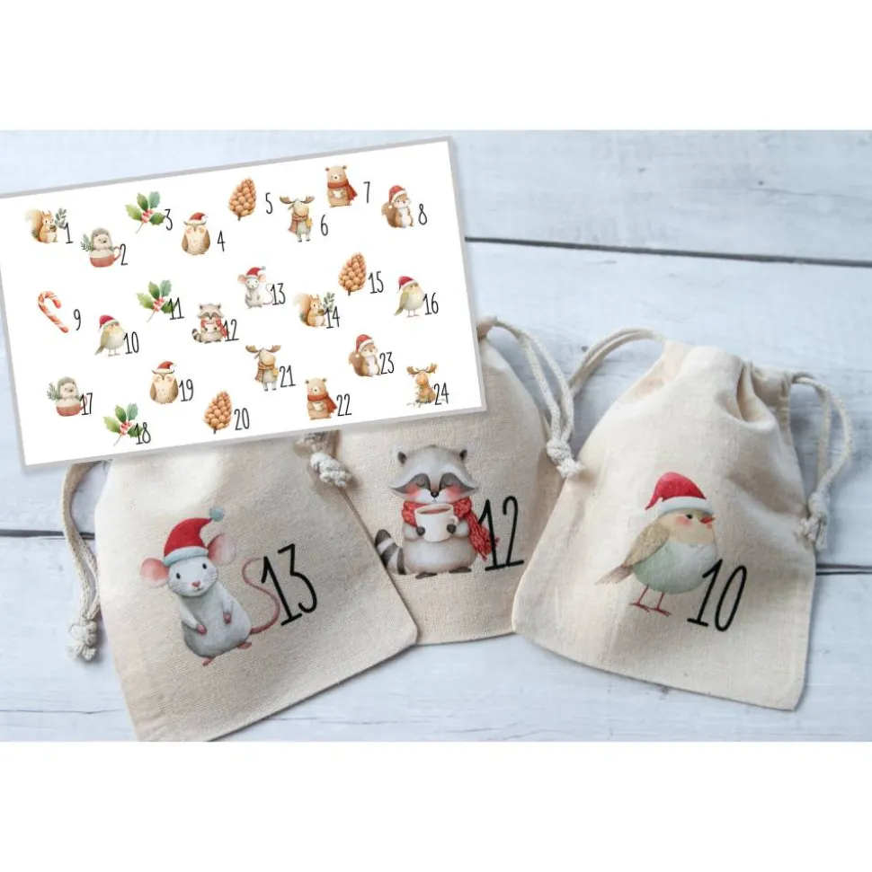 Diese 24 Adventssäckchen aus 100 % Baumwolle sind mit liebevollenWaldtier-Motiven und den Zahlen 1–24 bedruckt. Sie sind stabil, weich und idealfür Familien, die einen schlichten, skandinavischen Look mögen.