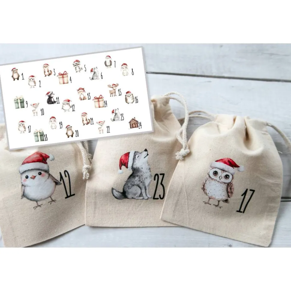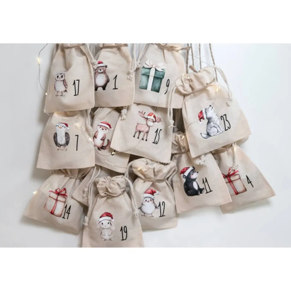 • 1 Set mit 24 bedruckten Baumwollbeuteln (ohne Inhalt/Deko)
