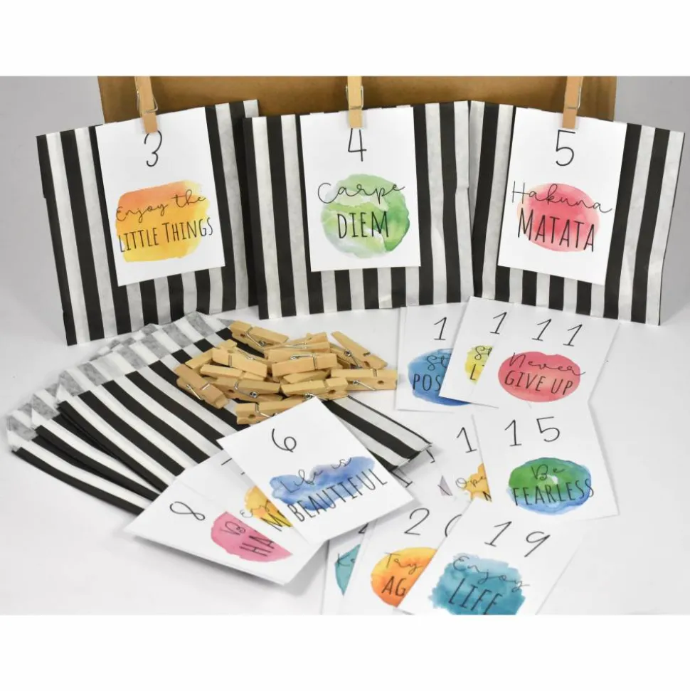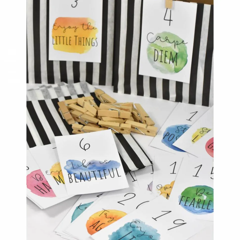 Adventskalender DIY mit Kraftpapiertüten, Zahlen und Holzklammern mir spirituellen Motiven
