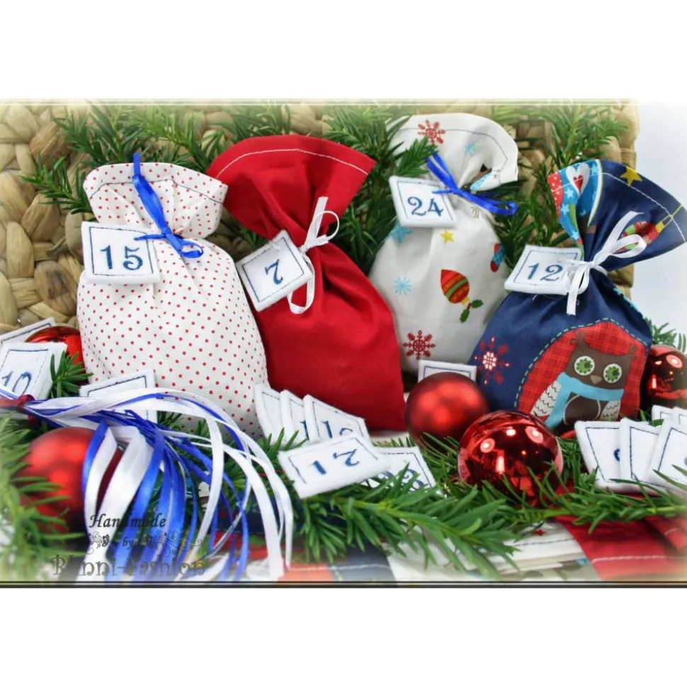 Wunderschöner Adventskalender bestehend aus 24 liebevoll in Handarbeit hergestellten Säckchen aus verschiedenen Baumwollstoffen. Zu den Adventskalender-Säckchen bekommst du auch die auf Filz gestickten Adventskalender-Zahlen und Satinband zum Binden.