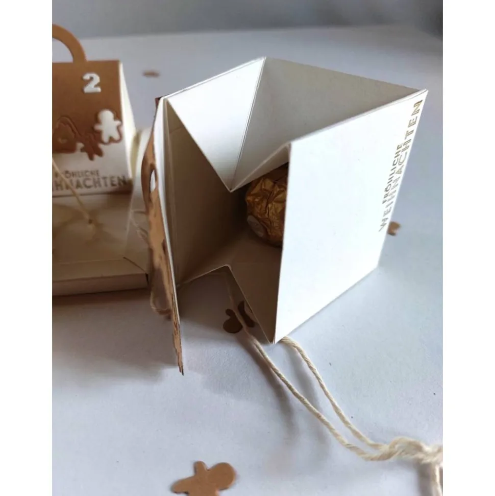 Gestalte jede Box individuell mit kleinen Geschenken, Süßigkeiten, persönlichen Botschaften oder Grüßen. Der Kalender besteht aus stabilen Dreiecksboxen, die aus hochwertigem Tonkarton gefertigt und mit einem weihnachtlichen Gruß bestempelt sind. Verschlossen werden die Boxen mit einer Schnur, der Klappenverschluss mit kleinem Henkel ist mit festlichen Motivausstanzungen verziert.
