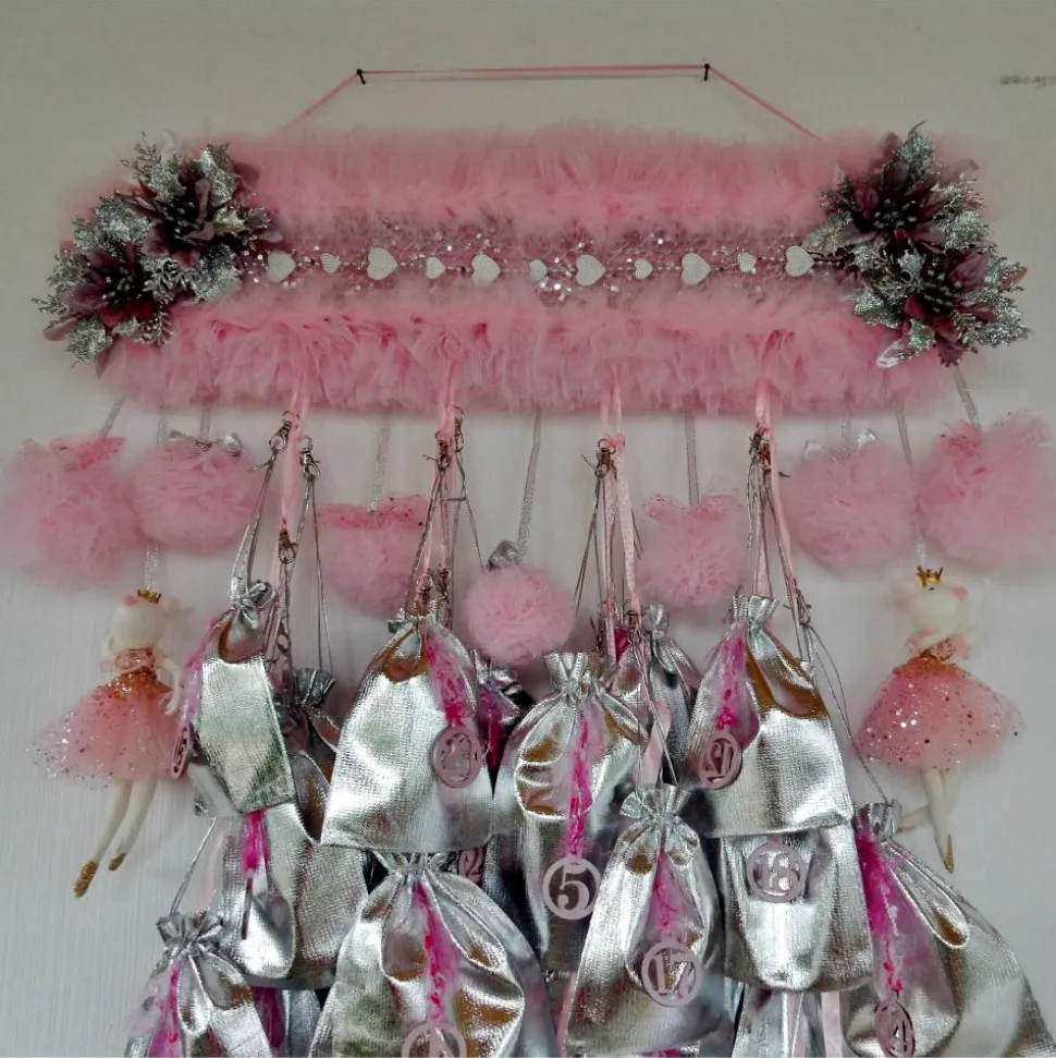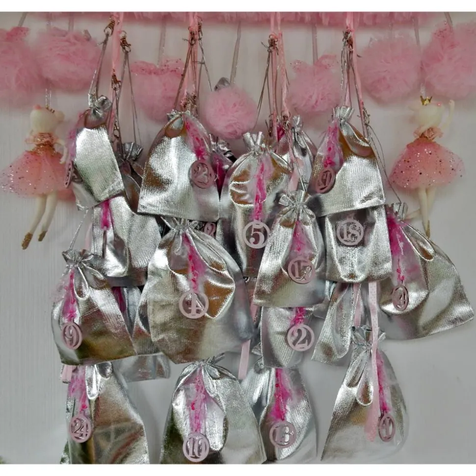Dieser wunderschöne Adventskalender ist ein echter Hingucker und bringt festlichen Glanz in jedes Zuhause. Das Design besticht durch eine liebevolle Kombination aus zartem Rosa, flauschigen Elementen und edlen silbernen Säckchen. Dekorative Akzente wie glitzernde Tannenzweige, kleine Herzchen und zwei elegante Ballerina-Figuren machen diesen Kalender zu etwas ganz Besonderem.