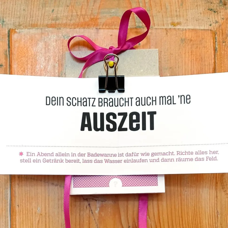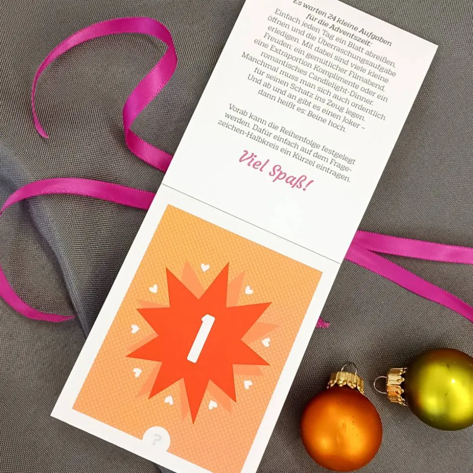 Die 24 Überraschungsaufgaben sind speziell für Paare konzipiert – einfach abwechselnd abreißen, öffnen und die Aufgabe lösen. Mit dabei sind viele kleine Freuden: ein gemütlicher Filmabend, Frühstück im Bett, 100 Küsse, ein Obstteller für zwei, eine Extraportion Komplimente oder ein romantisches Candlelight-Dinner.