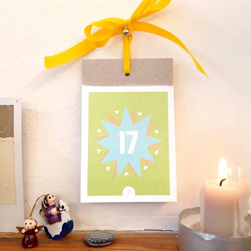 Die 24 Blätter des Kalenders sind wie bei einem Notizblock an der Oberseite geleimt. Jeden Tag wird ein Blatt abgetrennt, man öffnet die Doppelseite und dann kann auch schon losgelegt werden. Soll vorher festgelegt werden, wer an der Reihe ist, besteht die Möglichkeit, vorab ein Kürzel auf jede Seite einzutragen.