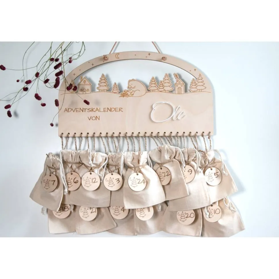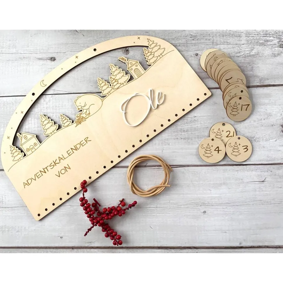 Unser Adventskalender aus 4 mm Birkensperrholz zeigt eine feineWinterlandschaft mit Bär. Der Name wird aus weißem Acryl gelasert und als3D-Schrift aufgesetzt – langlebig, gut lesbar und ein echter Hingucker imKinderzimmer. Dank sauberer Lasergravur, 60 cm Lederband zur Aufhängung und 24Befestigungslöchern unten lässt sich der Kalender schnell bestücken und jedesJahr wiederverwenden.