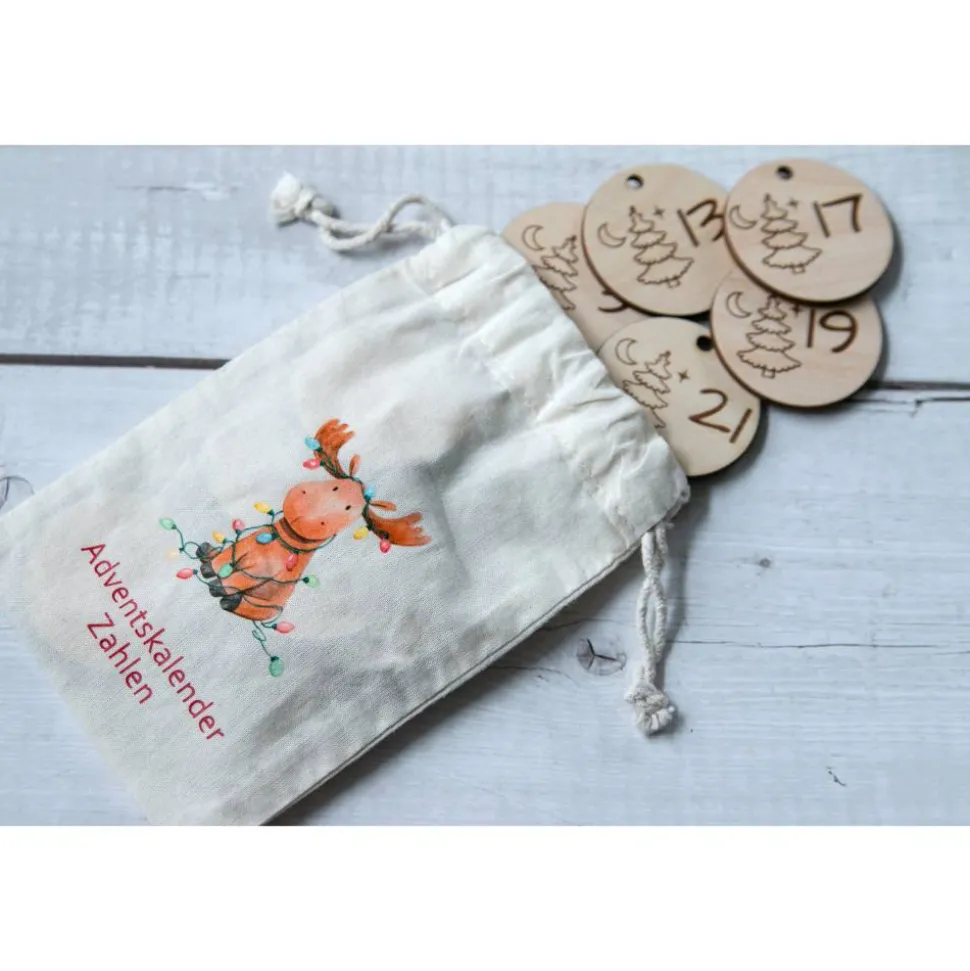 • Optional: 24 runde Zahlenanhänger, Birke 3 mm, graviert mit Tannenbaum, Mond& Sternen, je Ø4 mm Loch