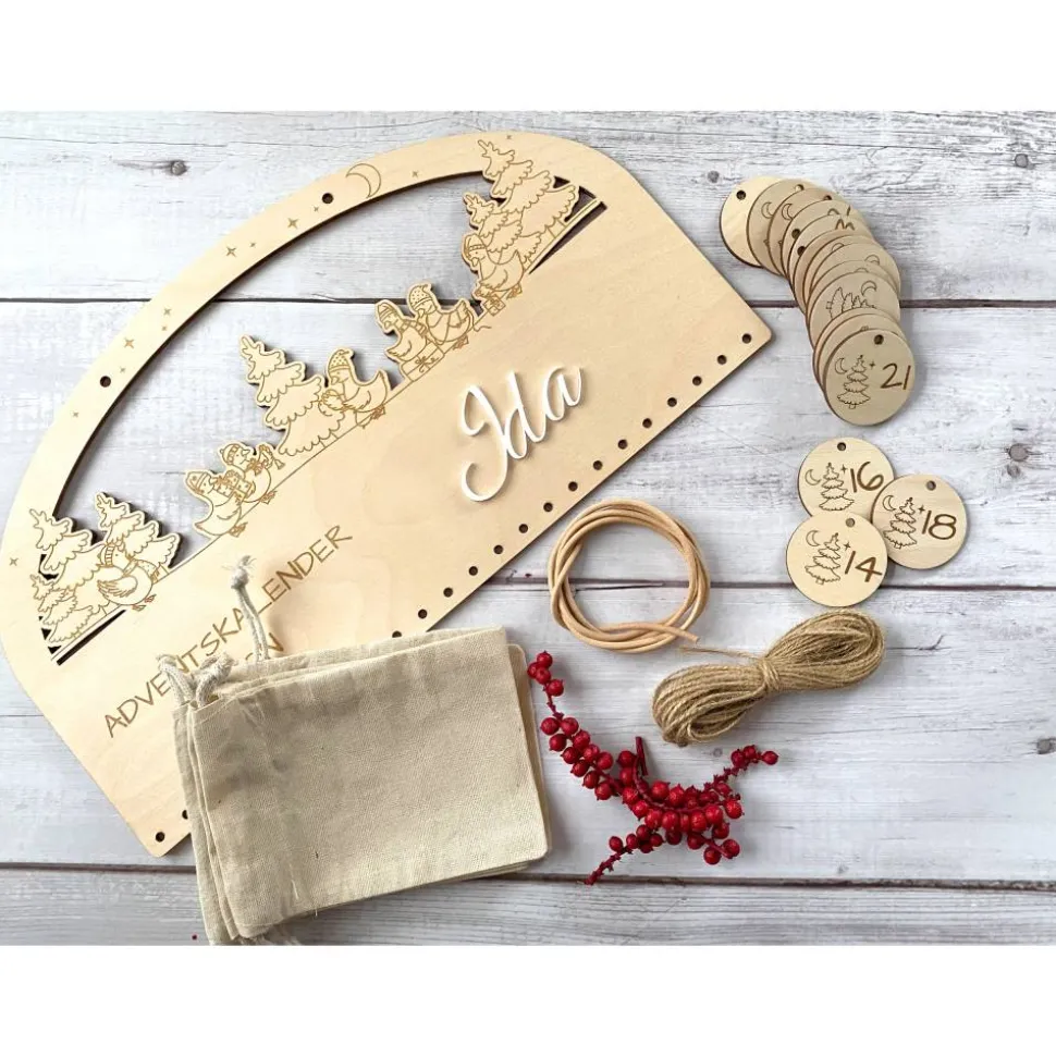 ????Optional: 24 runde Zahlenanhänger (3 mm Birke), graviert mit Tanne, Mond &Sternen, Ø 4 mm Loch.
