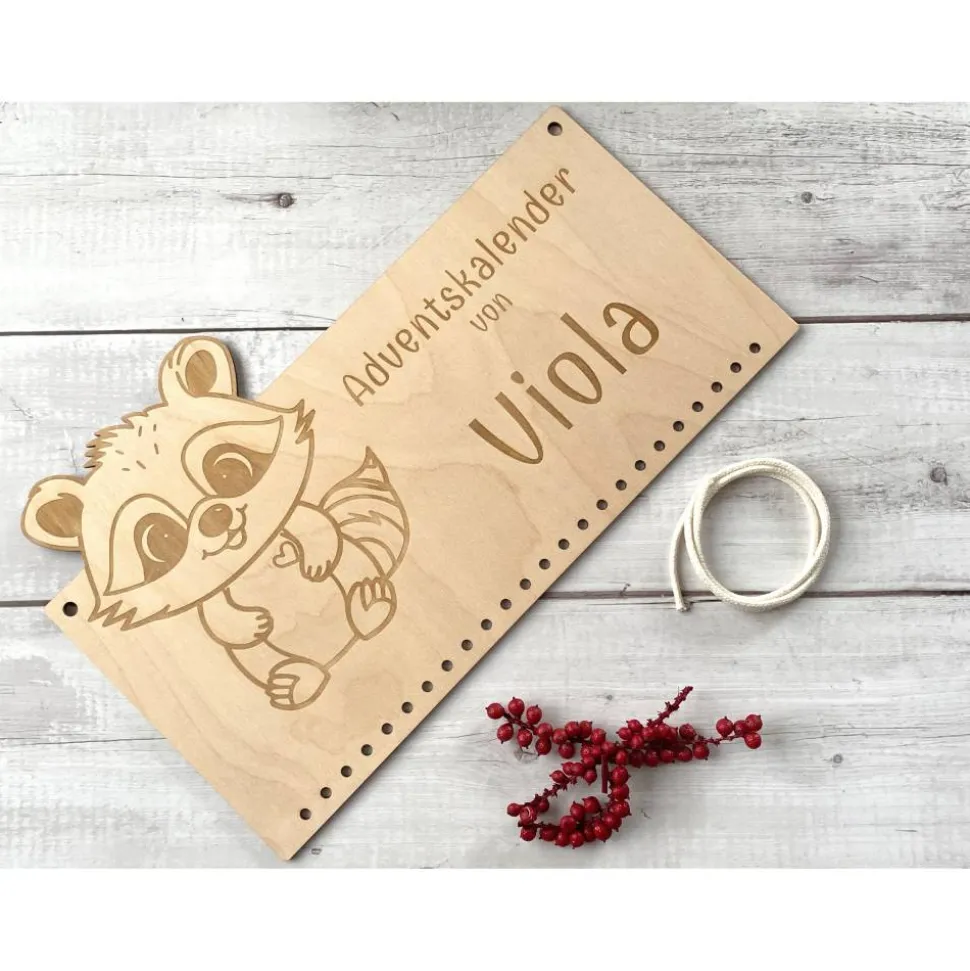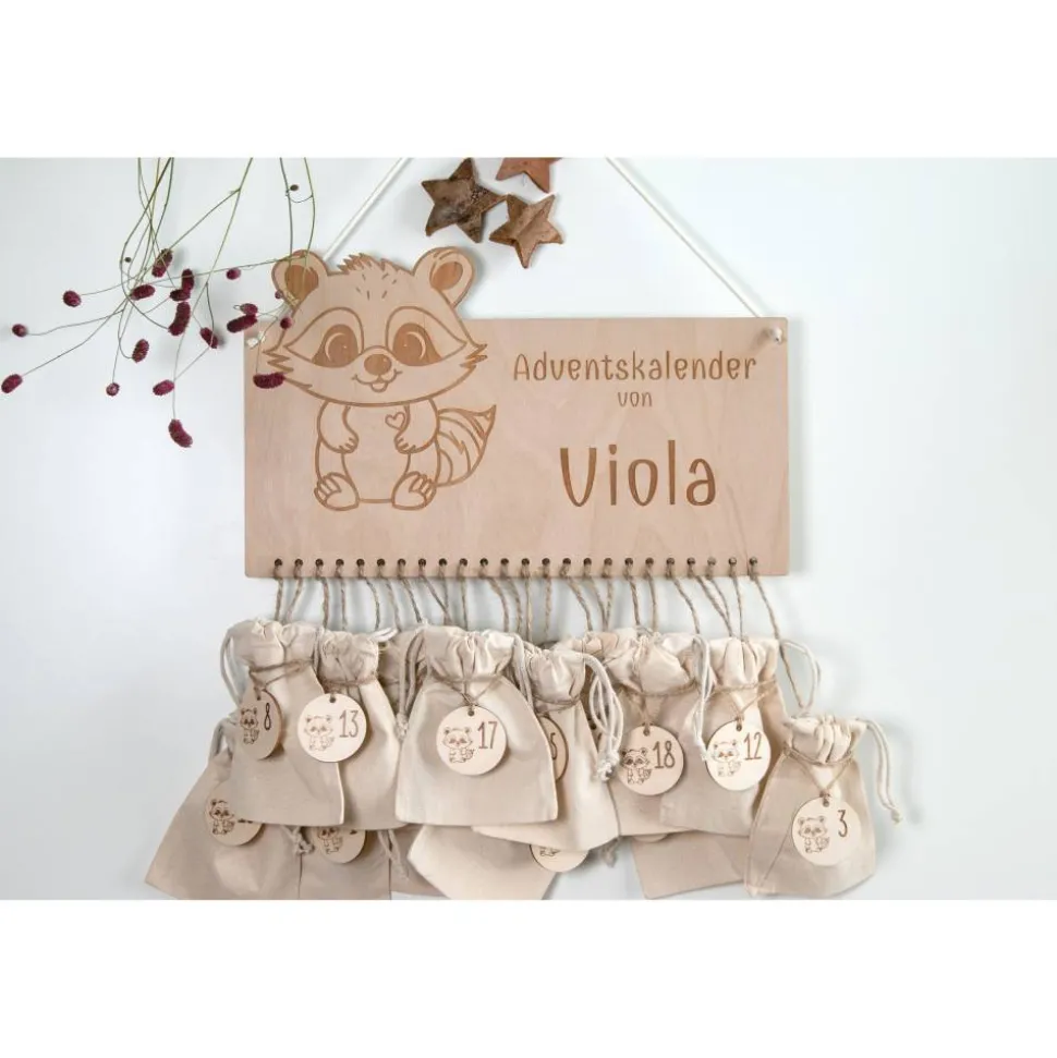 Ein hochwertiger Adventskalender aus 4 mm Birkensperrholz mit freundlichemFuchs und graviertem Wunschnamen. Das 36×22 cm große Brett wird präzisegelasert, sauber geschliffen und mit einer 65 cm langen Baumwollschnur zumAufhängen geliefert. Das Design ist ruhig, skandinavisch inspiriert und passtins Kinderzimmer ebenso wie ins Wohnzimmer.