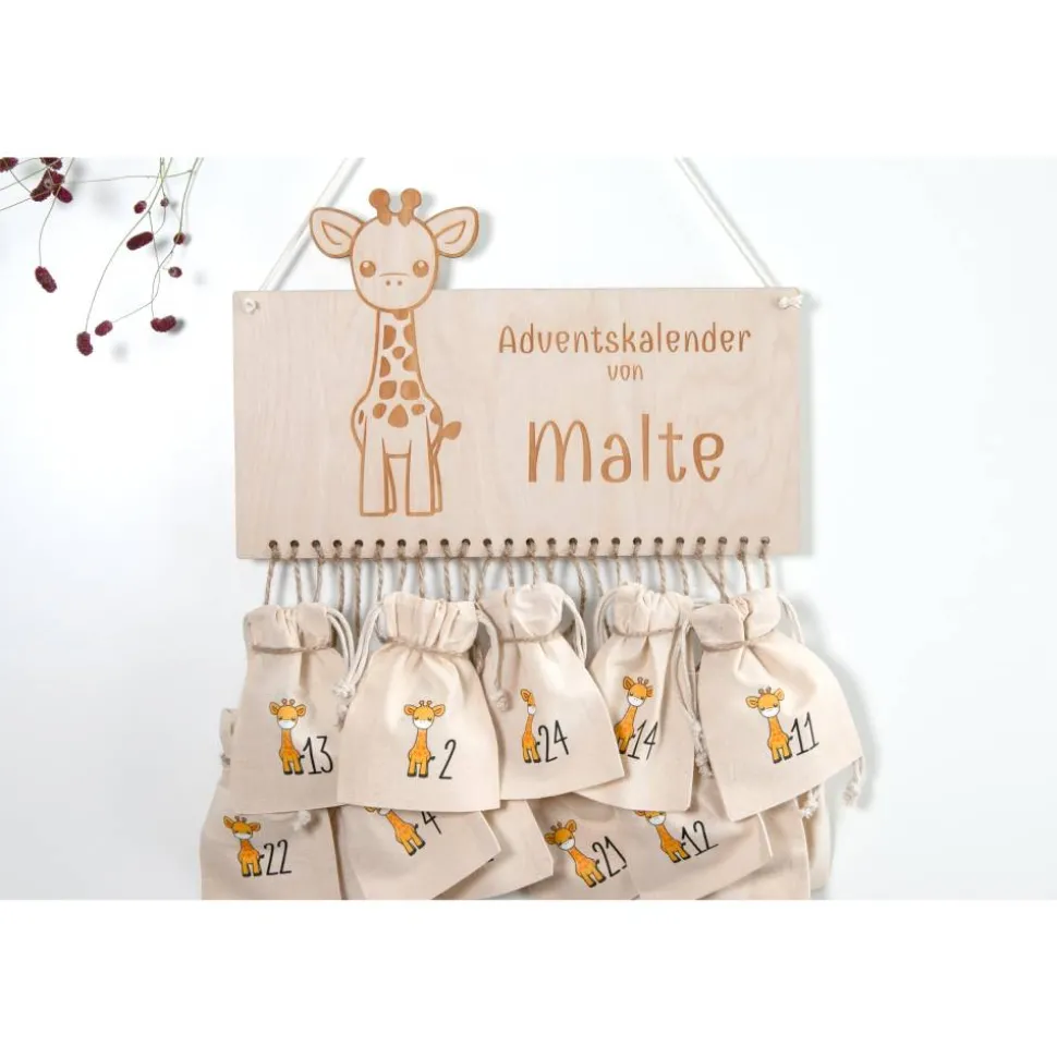 Auf Wunsch erhältst du den Kalender als Set mit 24 bedrucktenBaumwollbeuteln (Zahlen 1–24 + Giraffe, OEKO-TEX® STANDARD 100) und 12m Juteschnur. Einfach befüllen, aufhängen, fertig.