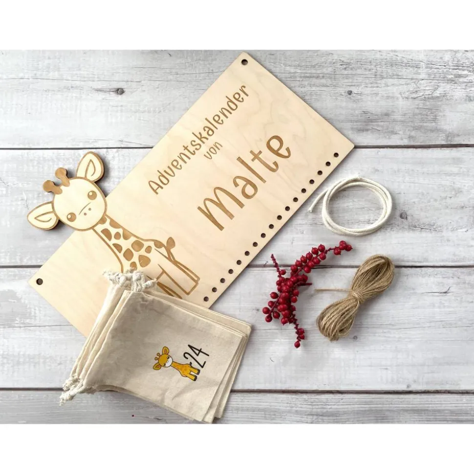 Der Adventskalender aus 4 mm Birkensperrholz wird mit deinem Wunschnamengraviert. Die freundliche Giraffe sorgt jeden Tag für Vorfreude –natürlich, schlicht und passend zu skandinavischer Deko. Das Brett misst ca.36×24 cm und kommt inkl. 65 cm Baumwollschnur zum Aufhängen.