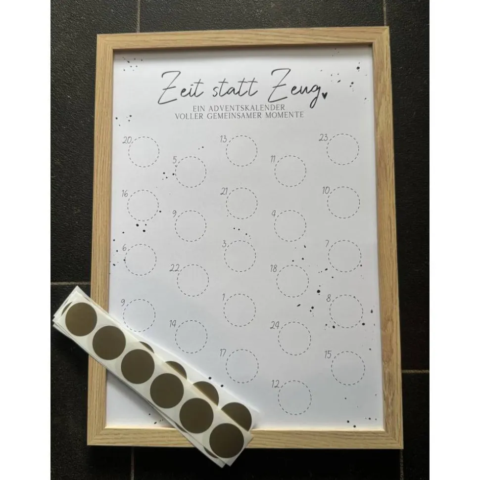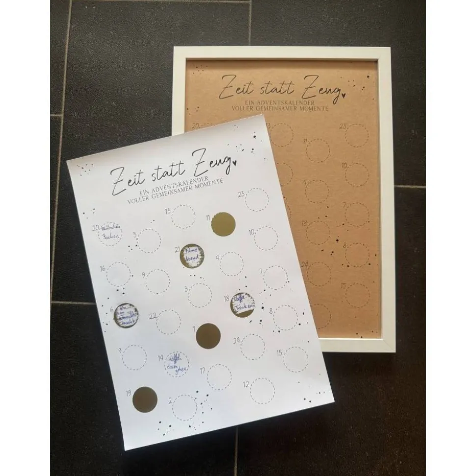 Ihr beschriftet die Kreise und klebt einen Rubbel- Sticker darüber, die beschenkten rubbeln mit einer Münze, ein Feld des jeweiligen Tages frei.