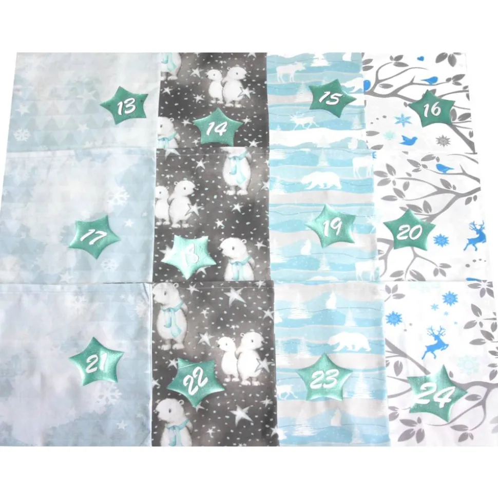 Entdecken Sie das Adventskalender Komplettset zum Befüllen XL Wandhänger Eisbärchen! Dieser liebevoll genähte Adventskalender ist ein echter Hingucker für Kinder und Erwachsene. Hängen Sie ihn einfach an die Wand oder Tür und überraschen mit 24 großen Stoff Säckchen zum selbst befüllen. Die Farben und Muster – hellblau, weiß, grau, türkis mit Eisbärchen, Hirschen, Wölfen, Vögeln und winterlichen Motiven – bringen Winterzauber in ihr Zuhause. Jedes Set gibt es nur einmal in dieser Farbzusammenstellung!