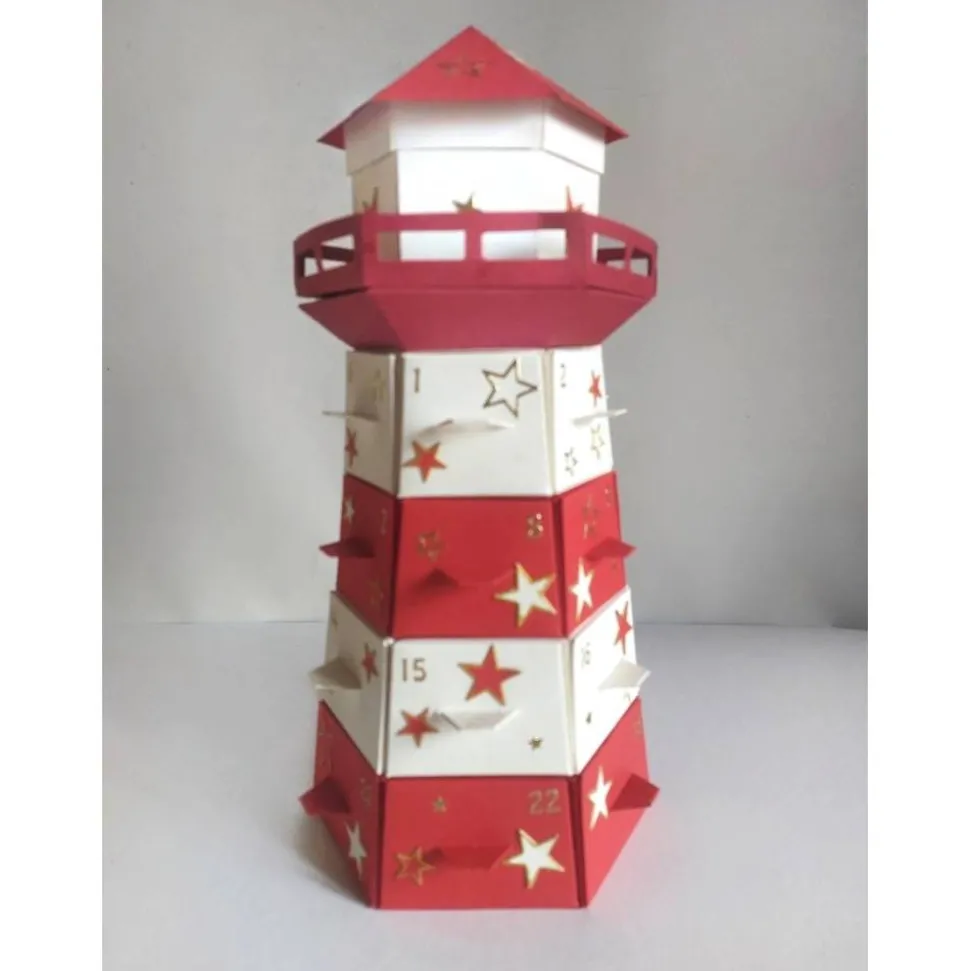 Entdecke den außergewöhnlichen Adventskalender Leuchtturm zum Selbstbefüllen in edlem Rot/Cremfarben. Dieses einzigartige Unikat besteht aus 24 kleinen Schubfächern sowie einem größeren Turmfach, das sich perfekt für ein besonderes Geschenk eignet. Der Kalender ist ca. 30 x 15 x 15 cm groß und wiegt etwa 170 g. Der große Behälter am oberen Teil hat ohne Deckel die Maße 9 x 7,5 cm und ist mit Deckel 10,5 cm hoch.