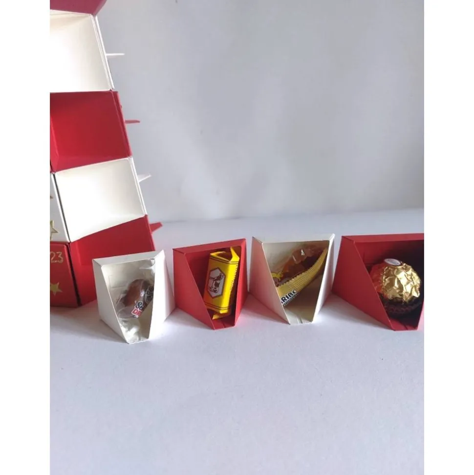 Hinweis: Aufgrund der schrägen Wände passen in die kleinsten Fächer nur kleine Schokotäfelchen oder Bonbons, in die größeren Fächer aber auch Geschenke bis zu 3 cm.