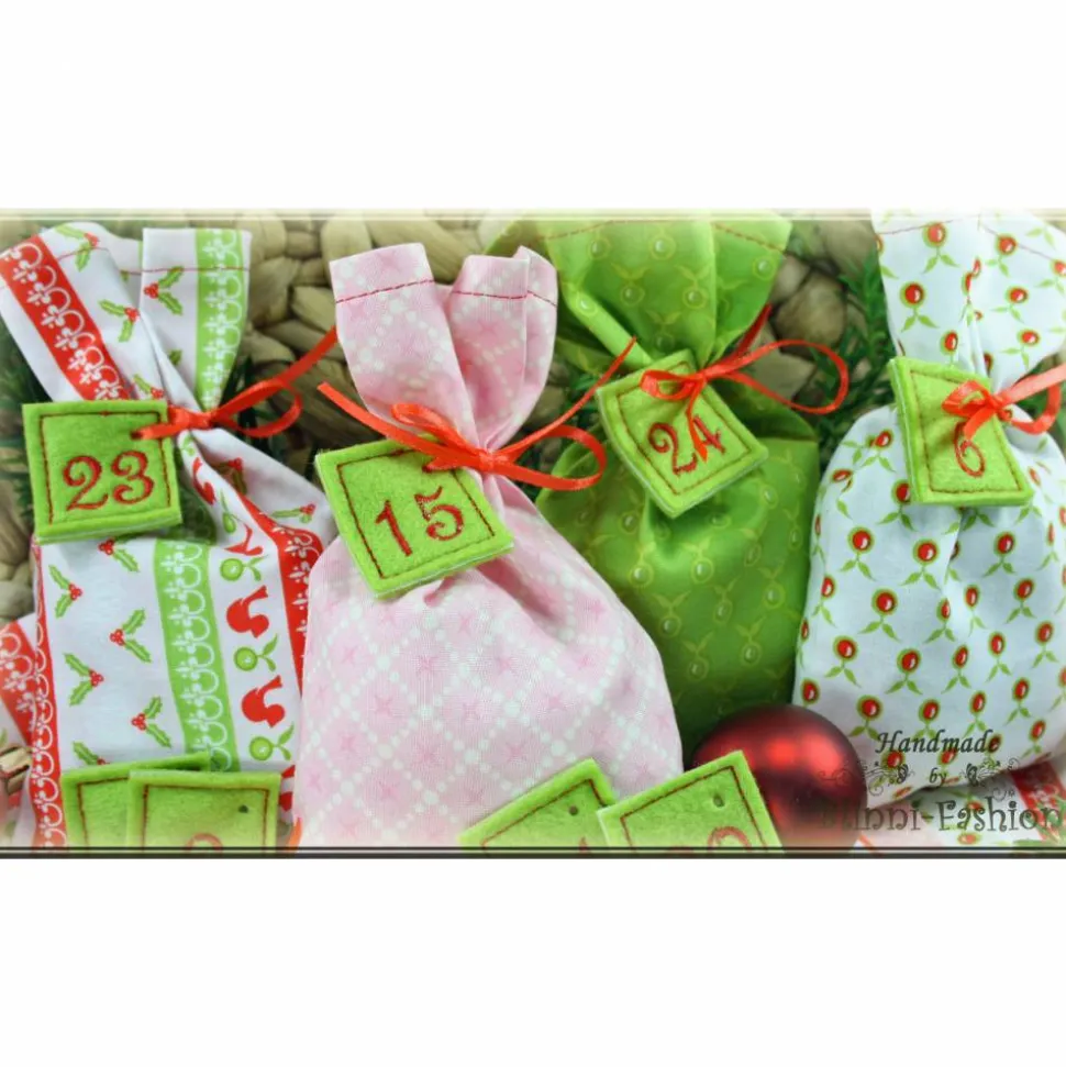 Traumhafter Adventskalender bestehend aus 24 liebevoll genähten Säckchen aus weihnachtlichen Designstoffen von Riley Blake mit Adventskalender-Zahlen in hellgrün bestickt mit den Zahlen von 1 – 24 und natürlich das passende Satinband zum Binden.