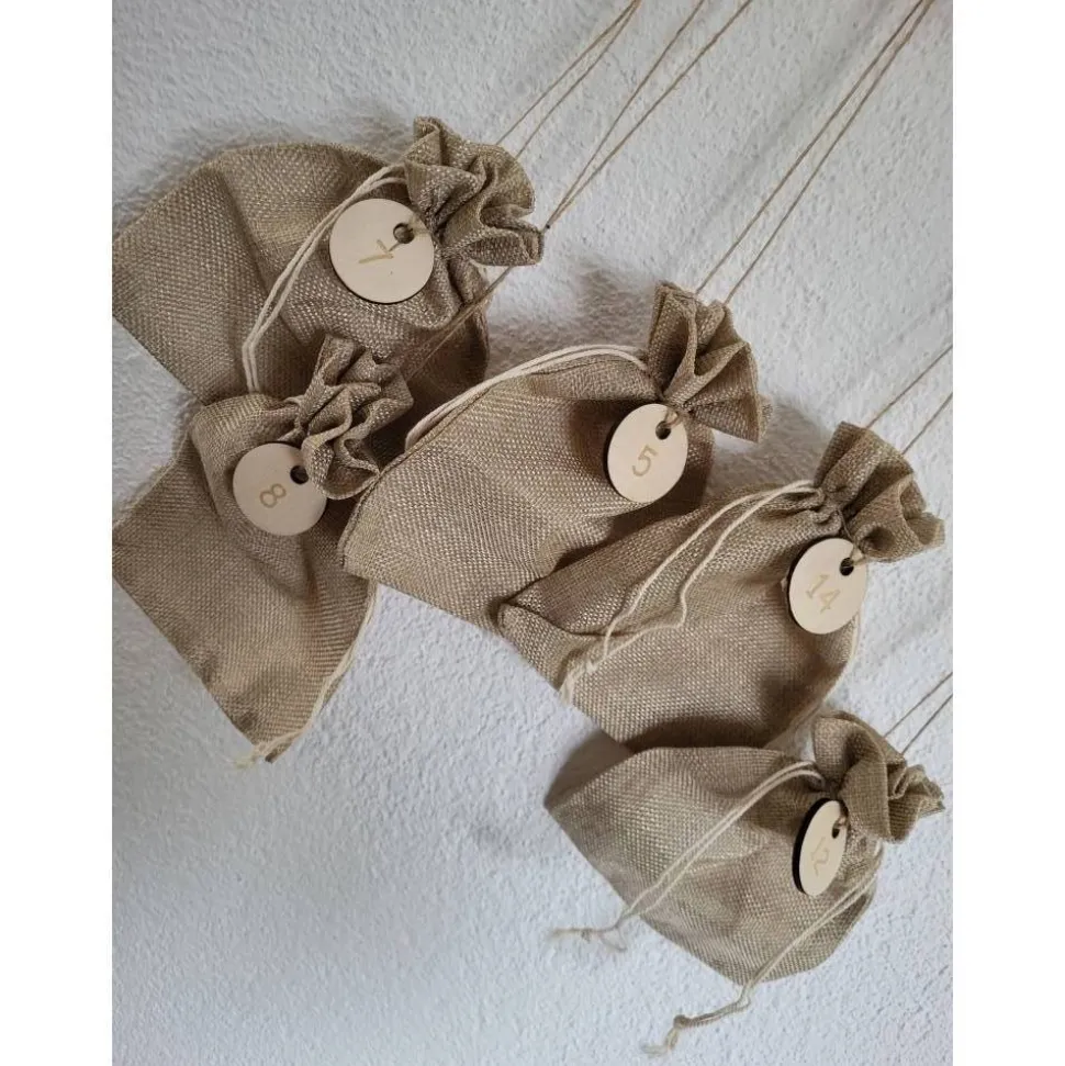 --> Die Bänder zum Befestigen der Jutesäckchen/ Holzzahlen sind im Lieferumfang nicht mit enthalten.