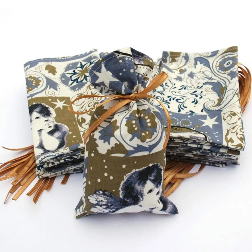 Gebunden werden die Säckchen mit goldenen Satinbändchen. Damit diese nicht verloren gehen, sind sie in der seitlichen Naht eingenäht.