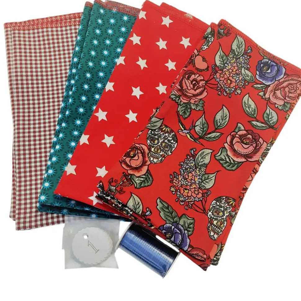 – 6 Säckchen rot mit Blumen und Totenkopf Motiven, 100% Baumwolle
