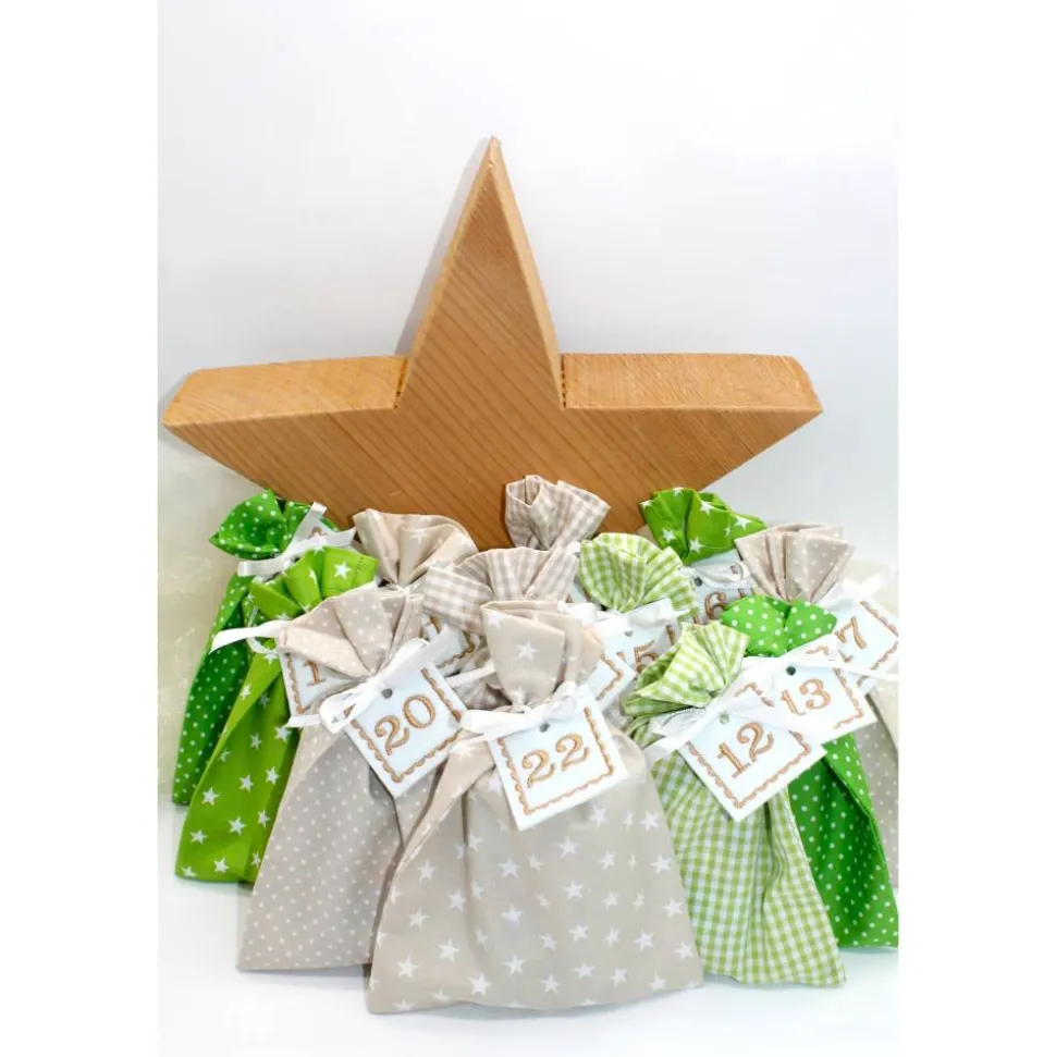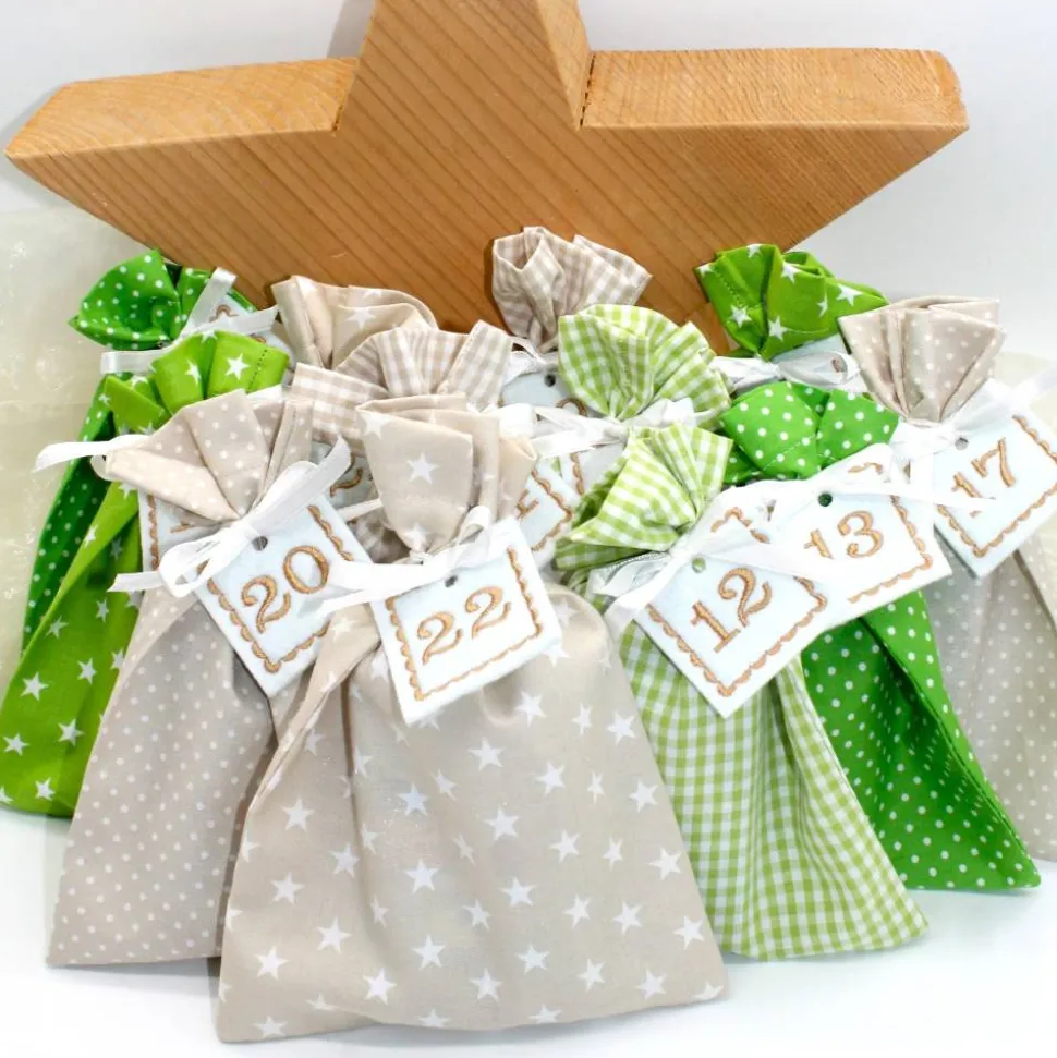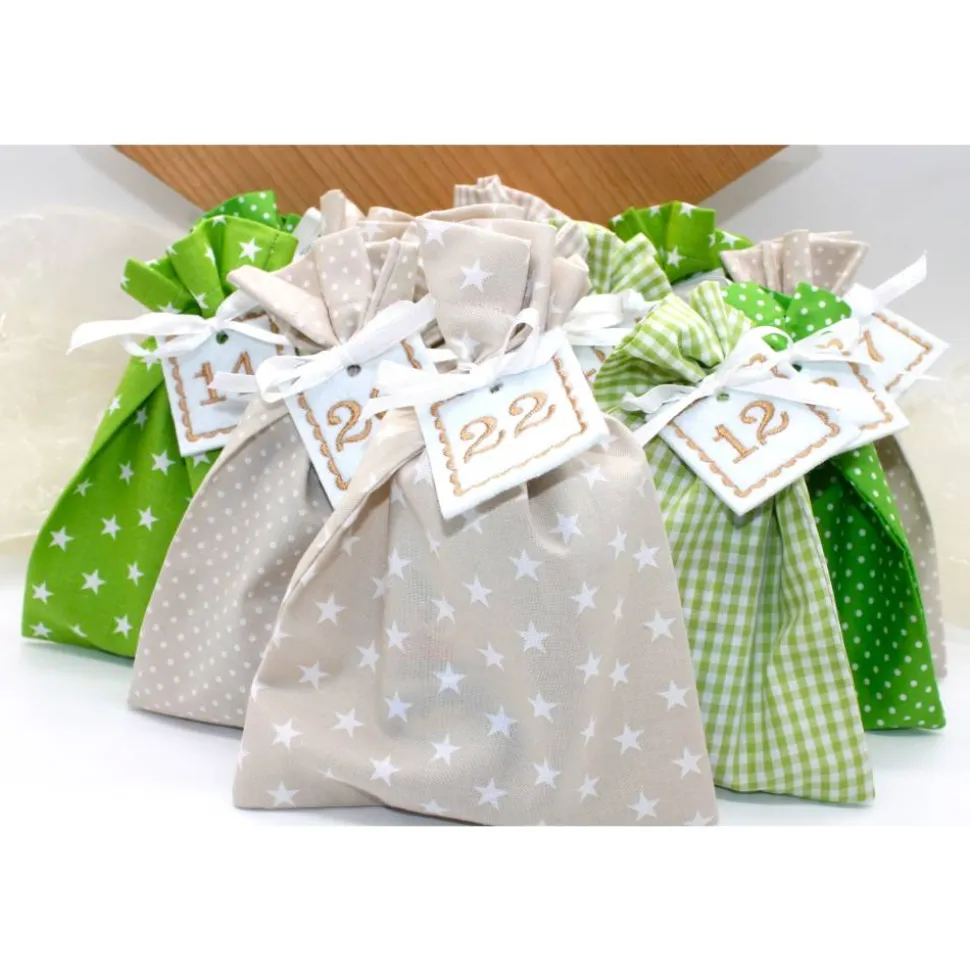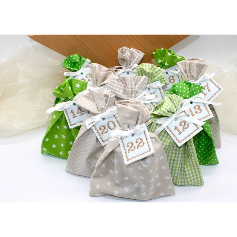 Das Set besteht aus 24 Säckchen in creme beige und grün, 24 bestickte Zahlen aus Filz und 24 Satinbändchen.