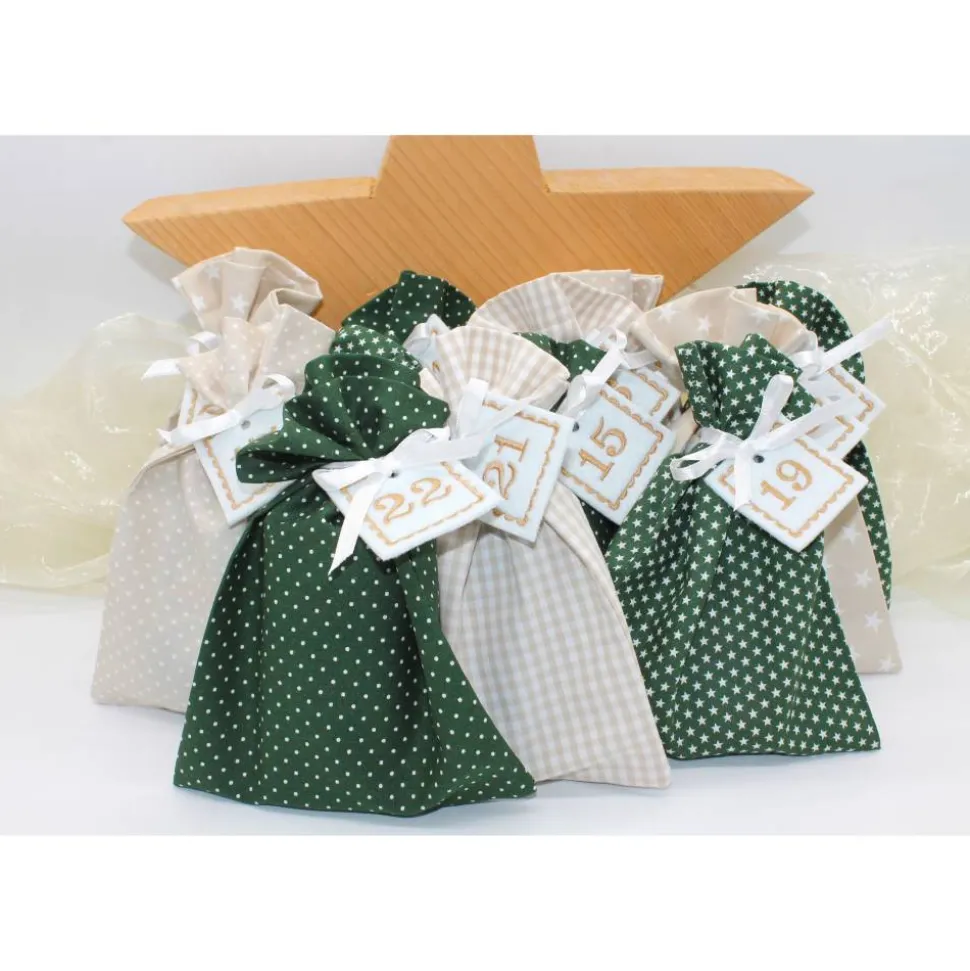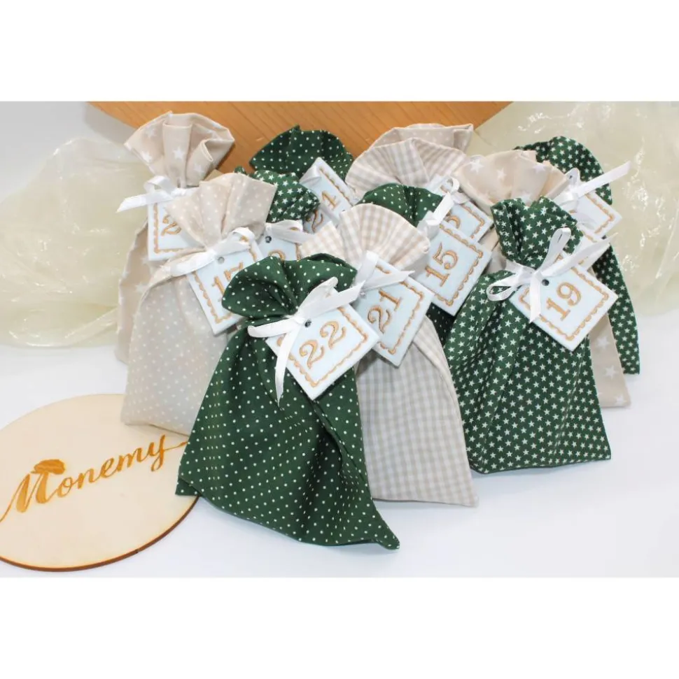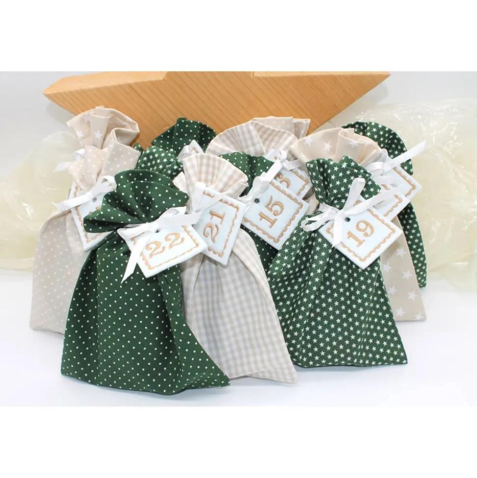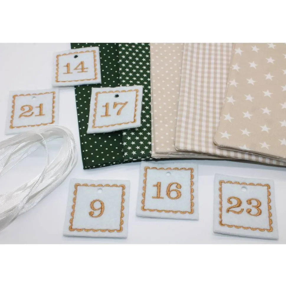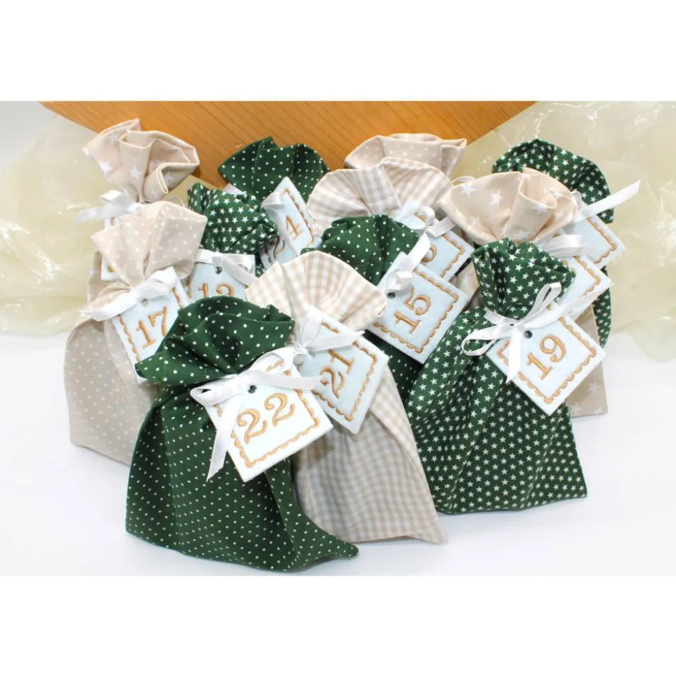 Das Set besteht aus 24 Säckchen in dunkelgrün beige, 24 bestickte Zahlen aus Filz und 24 Satinbändchen.
